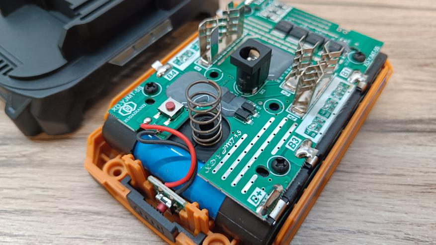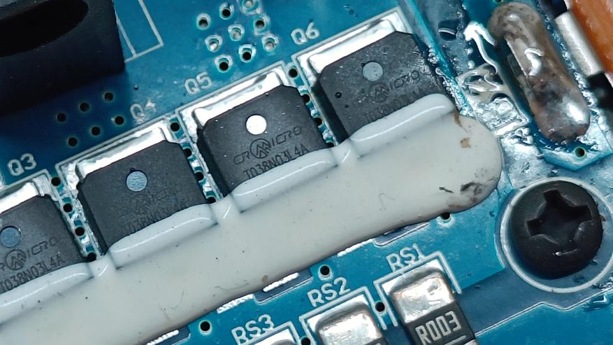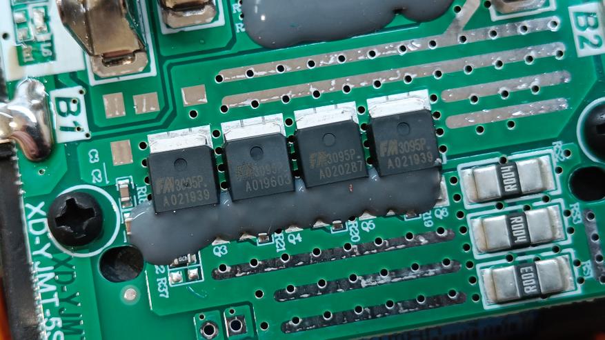 Штатный аккумулятор имеет качественную сборку, плата частично залита компаундом. Питание построено сразу на 4 транзисторах 3095P с максимальным рабочим напряжением до 60V и пиковым током до 50А. На плате присутствует вся необходимая маркировка, а вот термозащиты не предусмотрено.