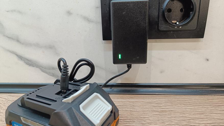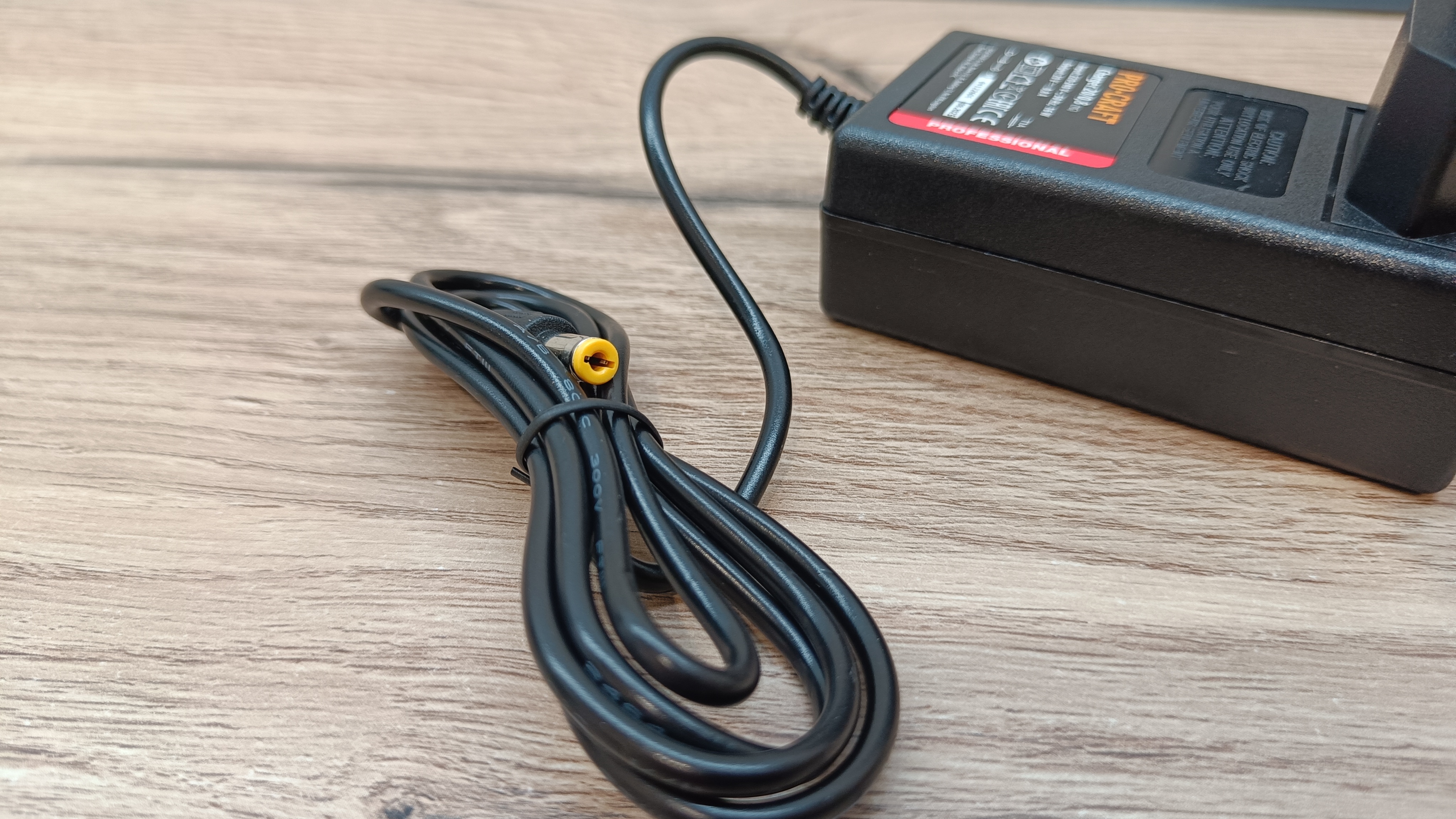 Внешний блок питания из профессиональной серии. Провод длиной чуть более метра, а на конце круглый штекер. На выходе блок питания выдает 20 V и 0,8А. Индикация режима заряда двухцветная. Красный — заряжается, зеленый — готов к работе.
