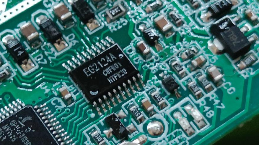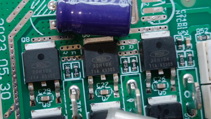 Плата управления на клеммниках с дополнительной защитой. Работает под управлением нескольких транзисторов 30H10K с максимальным напряжением в 30В и током отсечки в 110А. Плата частично защищена компаундом. Также есть пару микросхем, отвечающих за защиту от перегрузки, низкого разряда аккумулятора.