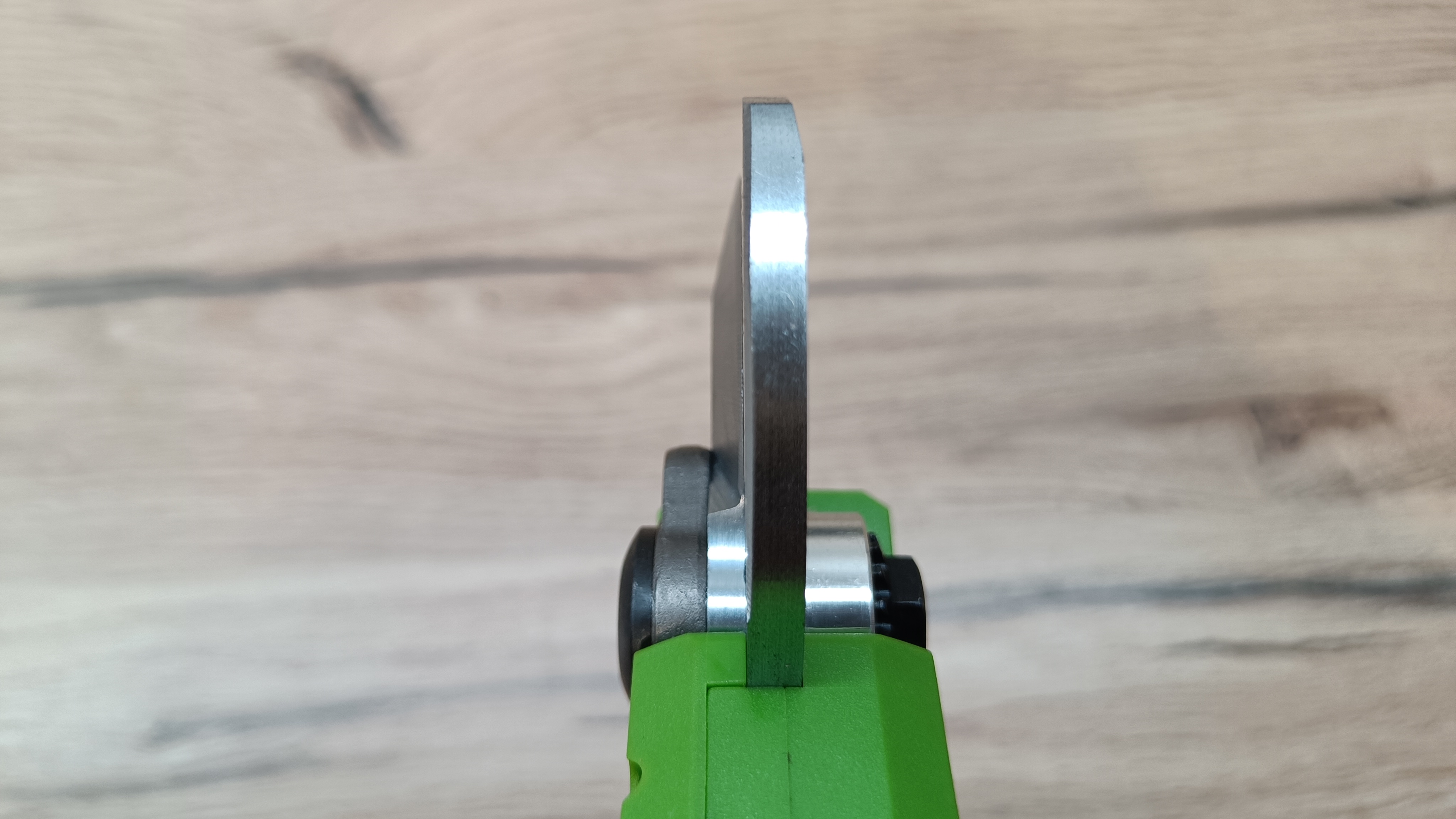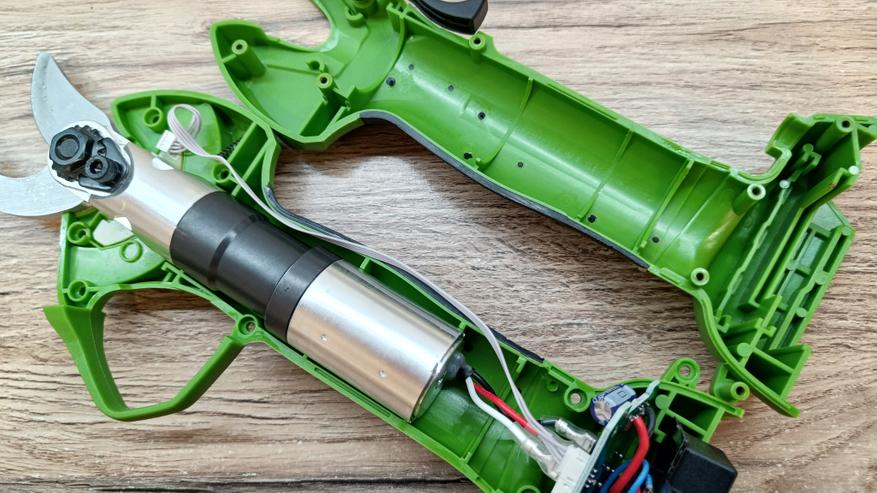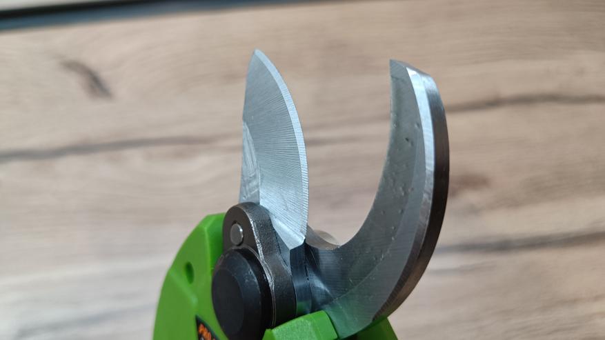Выполнен в крепком пластиковом корпусе зеленого цвета. Режущая поверхность выполнена из металла. Это два ножа, один из которых подвижный и перемещается по нажатию на курок. Толщина неподвижного ножа 5 мм, подвижный нож — 4 мм. Конструкция надежная и рассчитана на работу с ветками и сучками толщиной до 25 мм. Заточку имеет только подвижный нож.