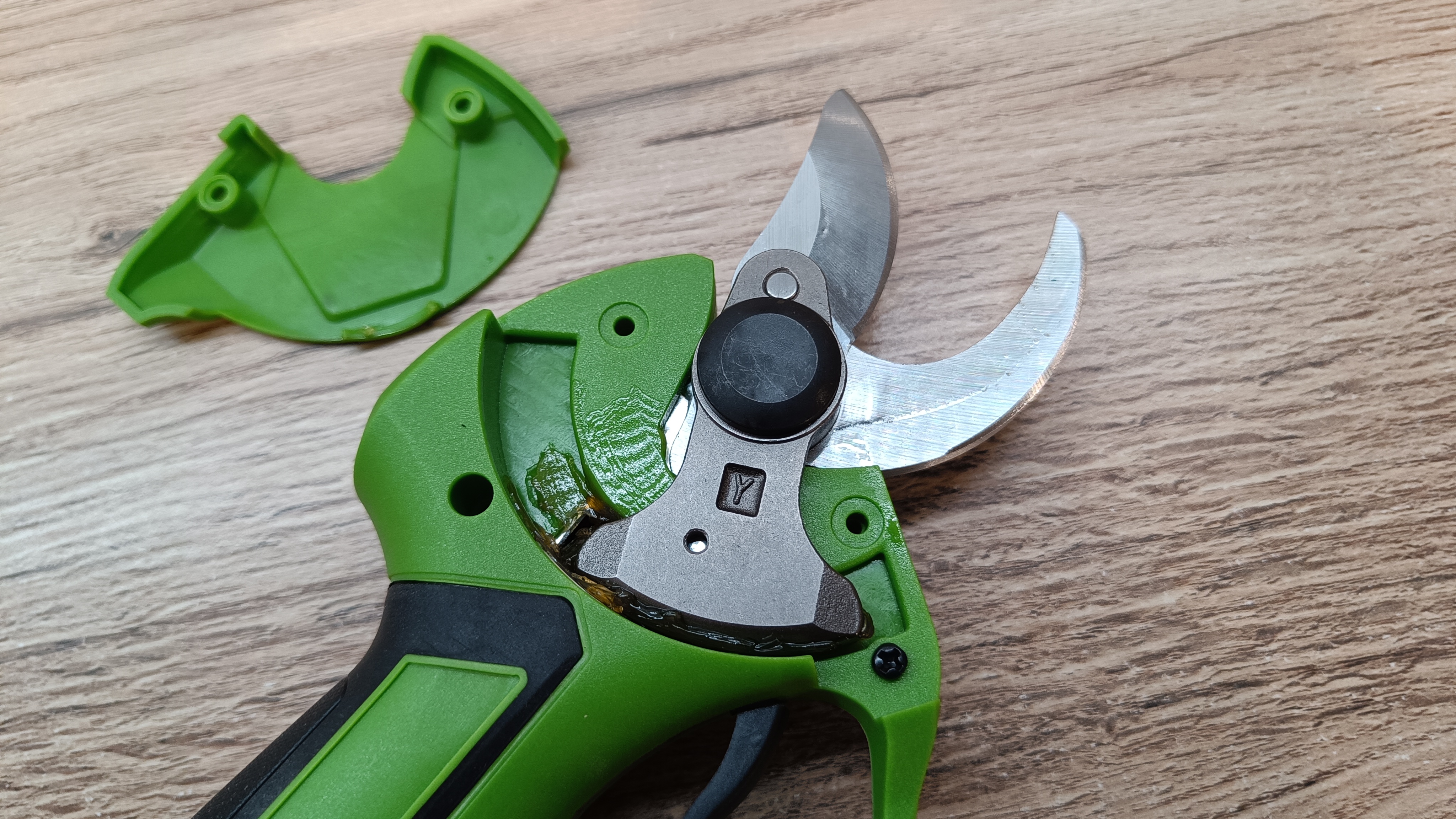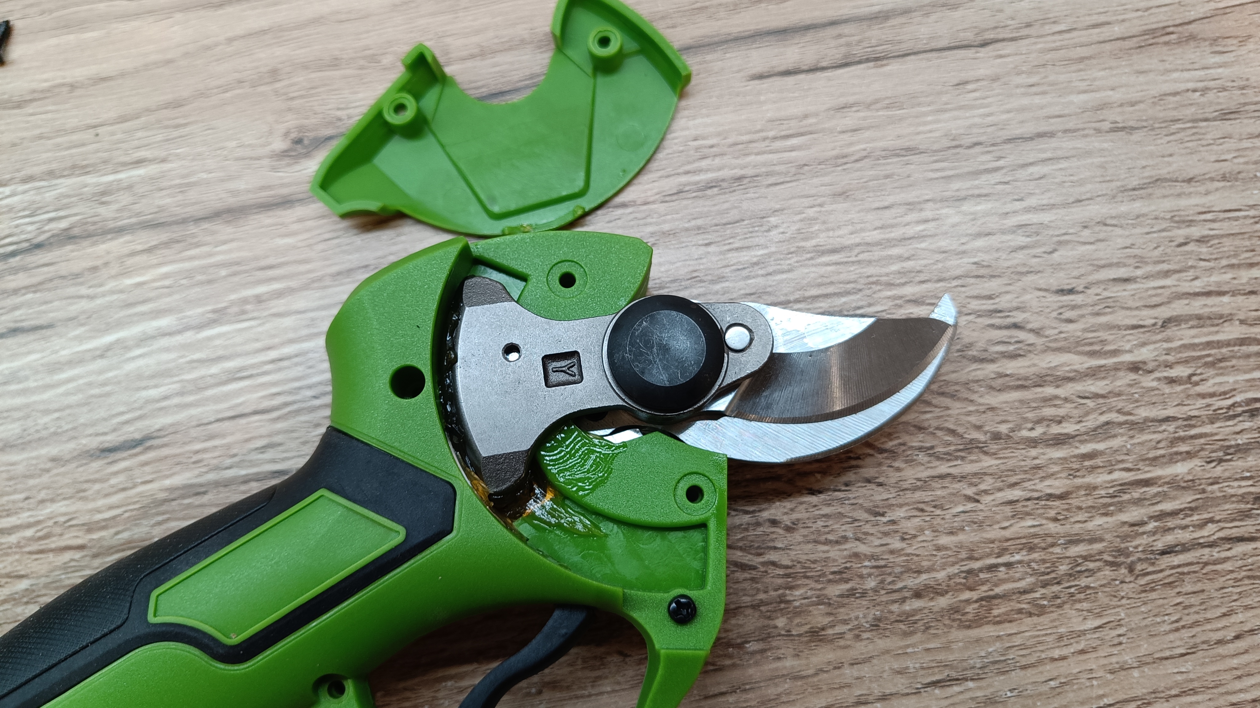 Смотрим, что внутри секатора. Снимаем крышку обслуживания ножей. Под ней видим подвижный нож с большим количеством смазки. Добавлять не потребуется, лишь в дальнейшем, когда она постепенно разойдется.