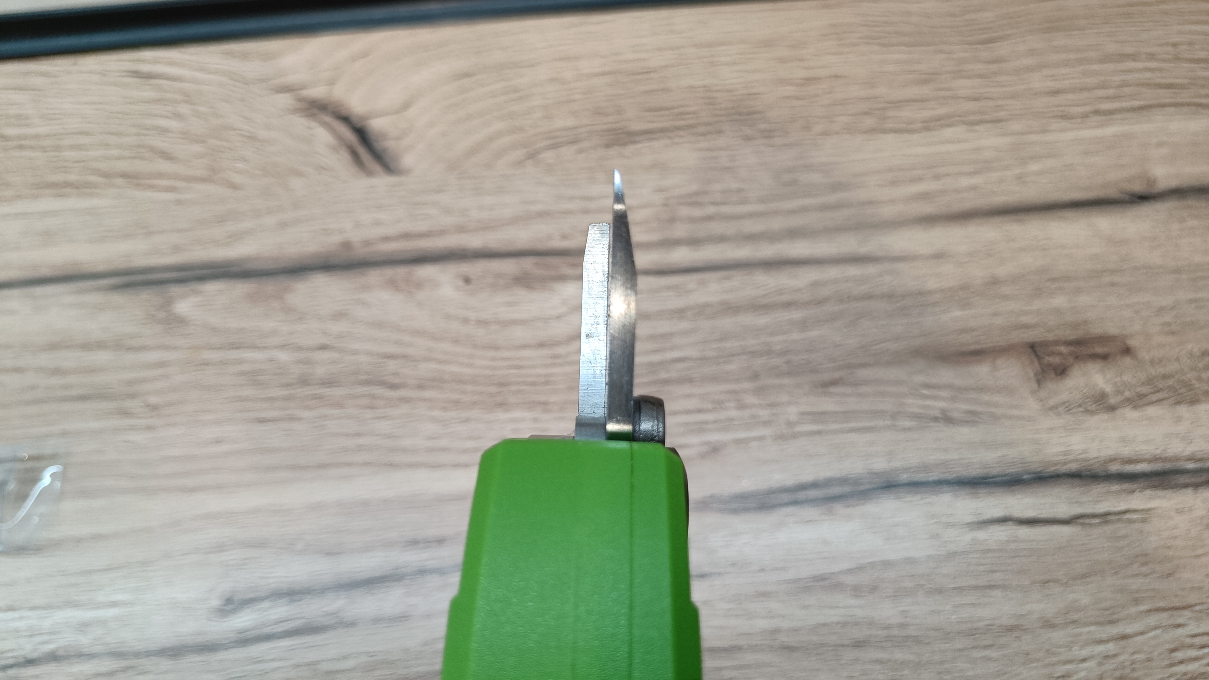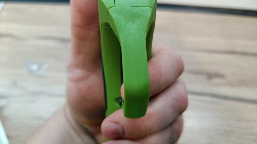 Активация режущего механизма за счет нажатия на курок. Нажимаем, и ножи почти моментально сходятся. Отпускаем, и ножи расходятся в номинальное состояние. Курок защищен от случайного нажатия пластиковой скобой. Даже при случайном падении, срабатывание полностью исключено.