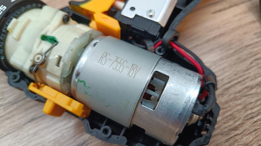 Электродвигатель RS-755S-18V, значительно крупнее своего собрата RS-550S, который в основном используется на шуруповертах. По сравнению с ним электродвигатель постоянного тока RS-755S-18V более мощный и имеет крутящий момент выше, своего младшего брата 550S. Данный двигатель частенько можно встретить на различной садовой технике или мощных электрических дрелях, так как выдерживает большие нагрузки. Редуктор с металлическими шестернями.