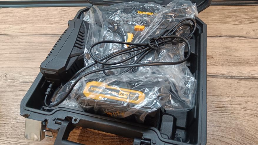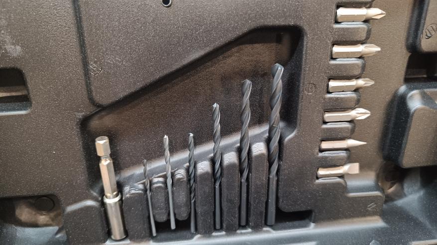 Внутри, кроме тушки шуруповерта, аккумулятора и зарядного устройства, есть еще и 6 сверла и 6 бит. Бумажная документация на русском языке. В дальнейшем можно дополнить кейс дополнительным аккумулятором, место под него есть.
