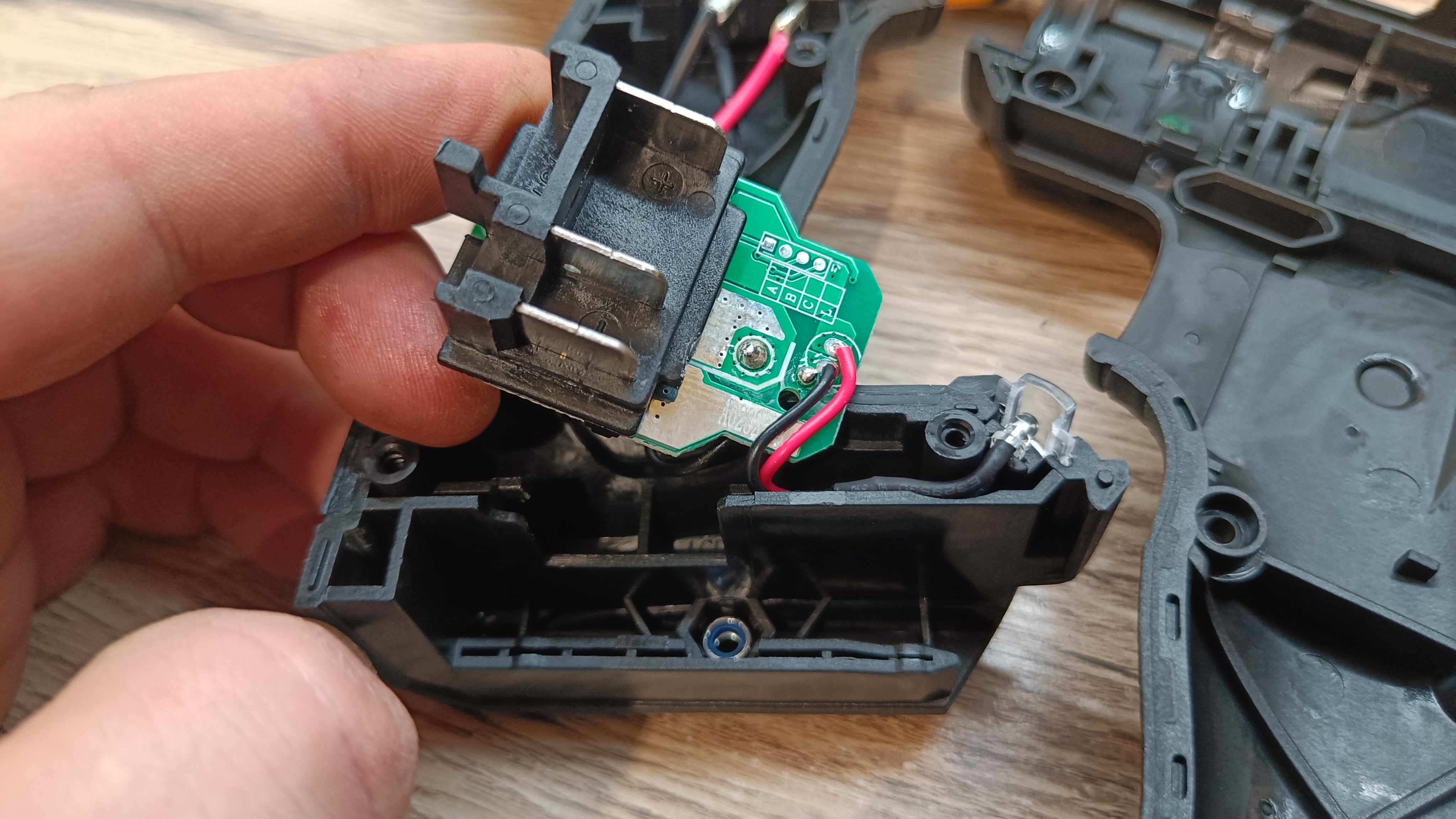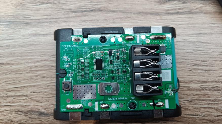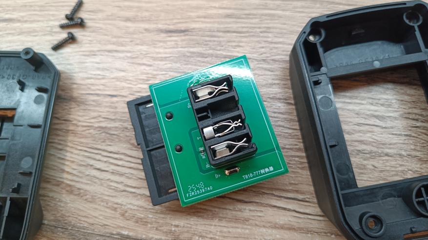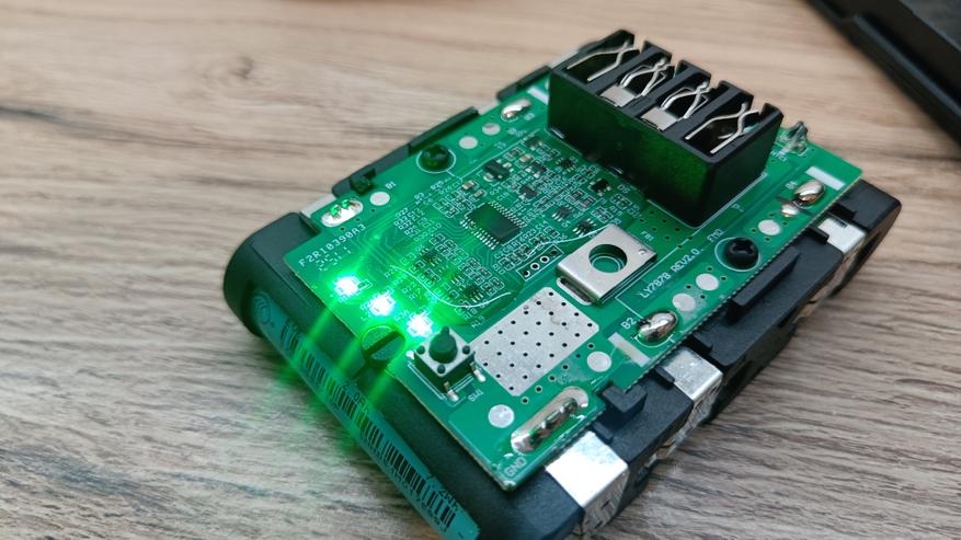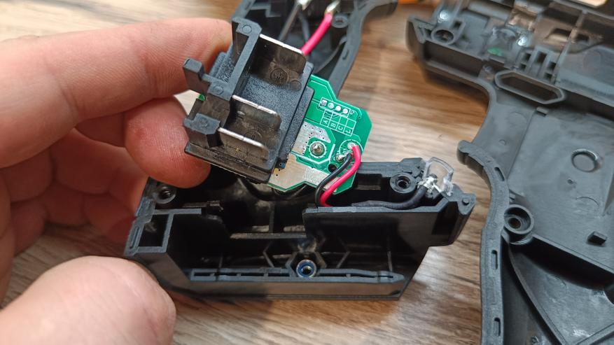 Разберем еще и переходник под макитовские аккумуляторы. Внутри небольшая плата и направляющие контактов.