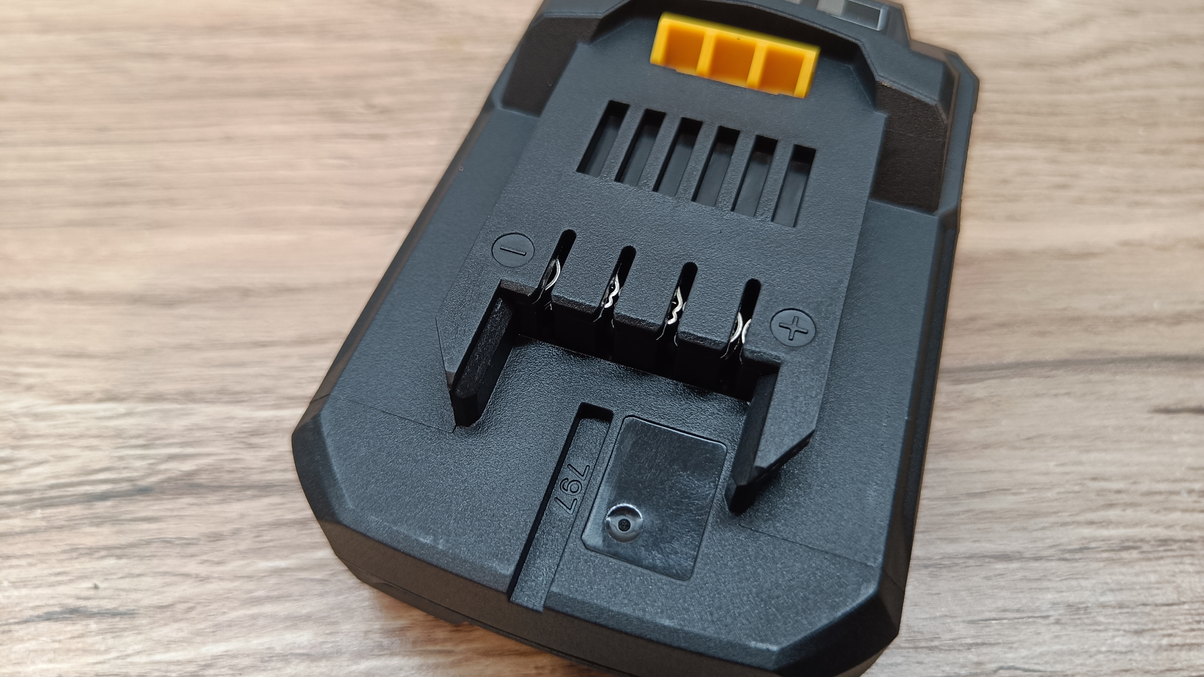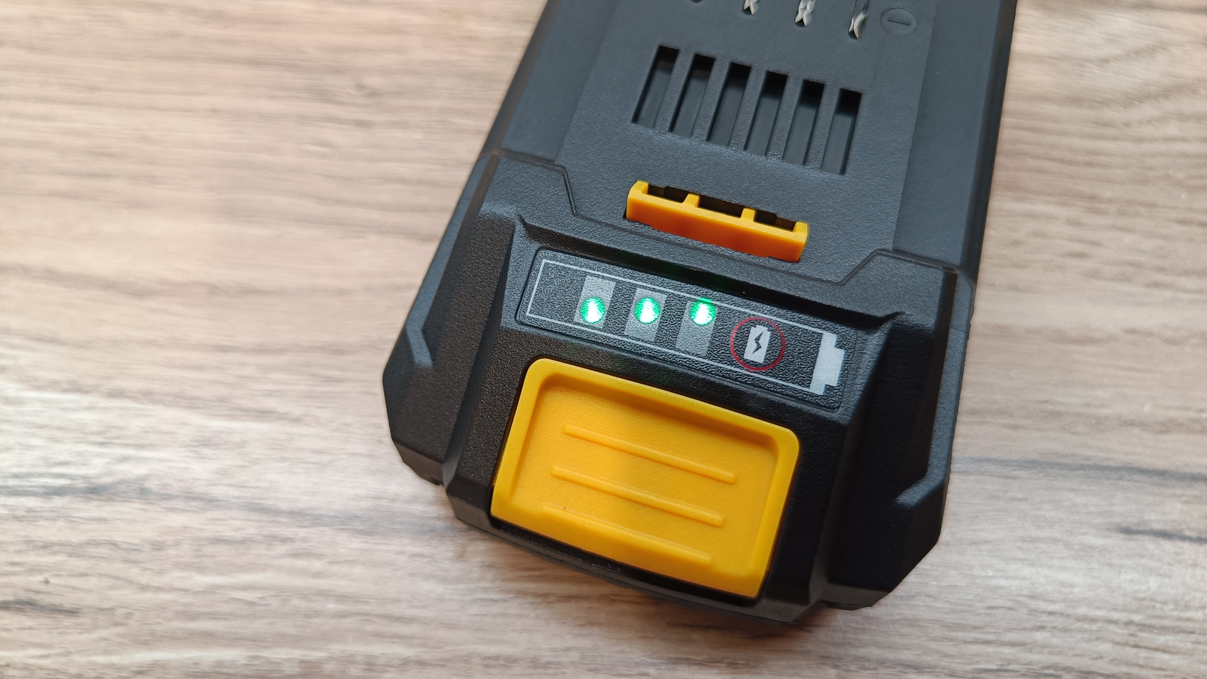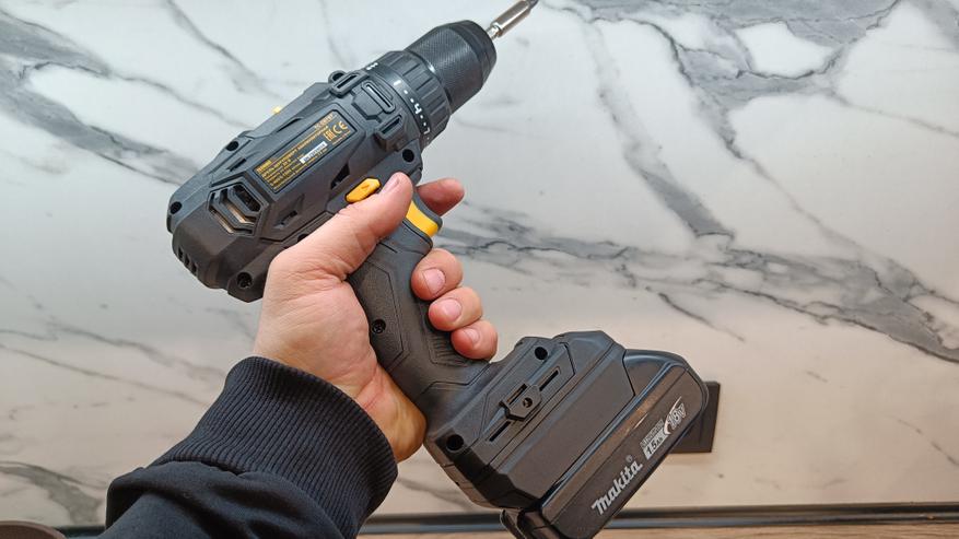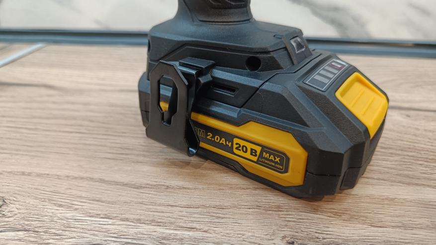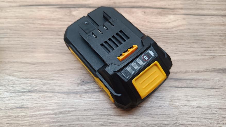 Шуруповерт пистолетного типа. В нижней части размещается аккумулятор со слайдерным креплением. Шуруповерт устойчив на горизонтальных поверхностях и не заваливается. Платформа аккумулятора достаточно широкая. На самом аккумуляторе можно увидеть индикацию уровня заряда, что значительно упрощает моменты эксплуатации. В случае нажатия на кнопку проверки, появится индикация из 3 светодиодов. Емкость в 2 Ач является золотой серединой, когда инструмент уже достаточно мощный, но еще не тяжелый для длительной работы.