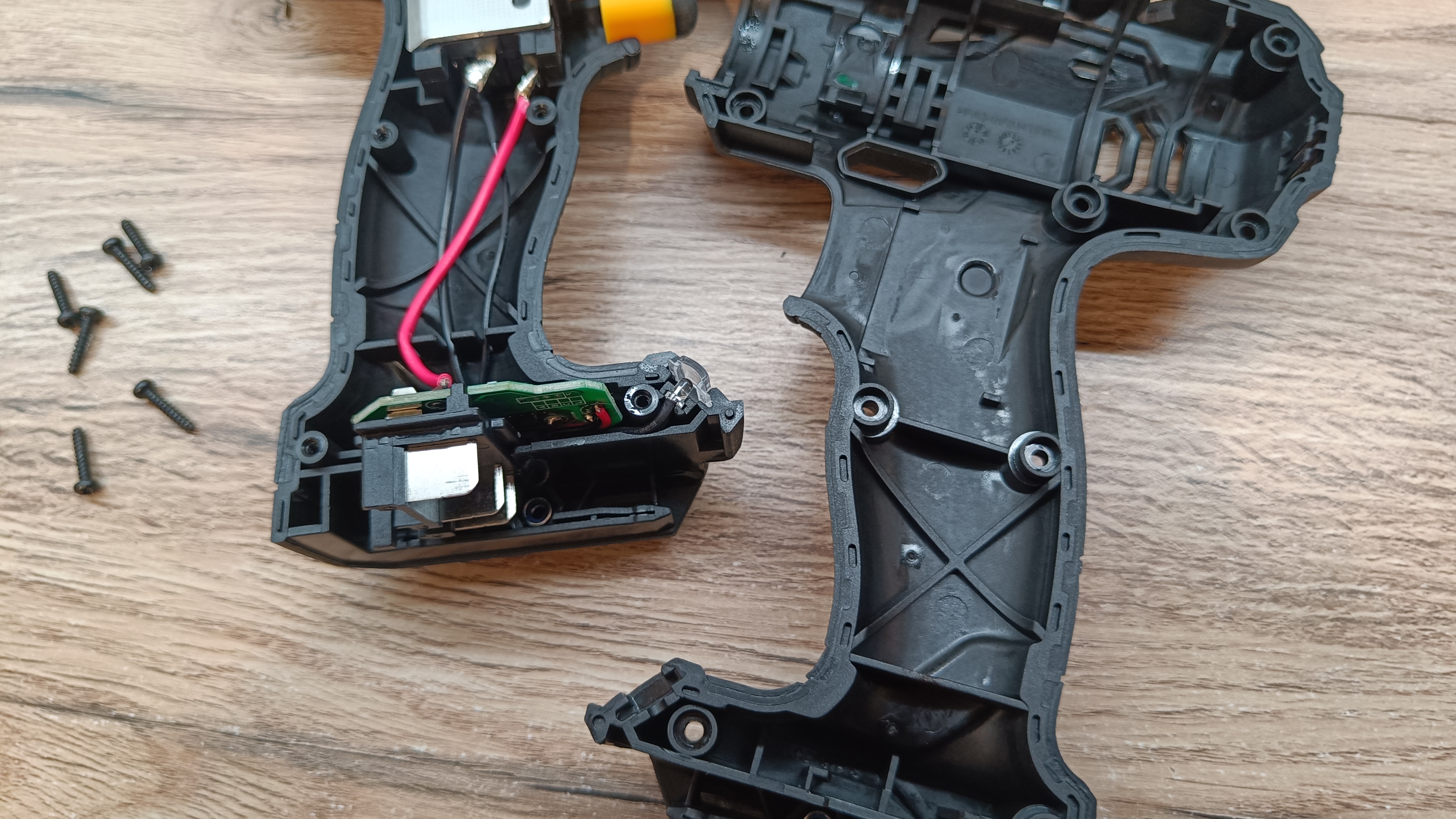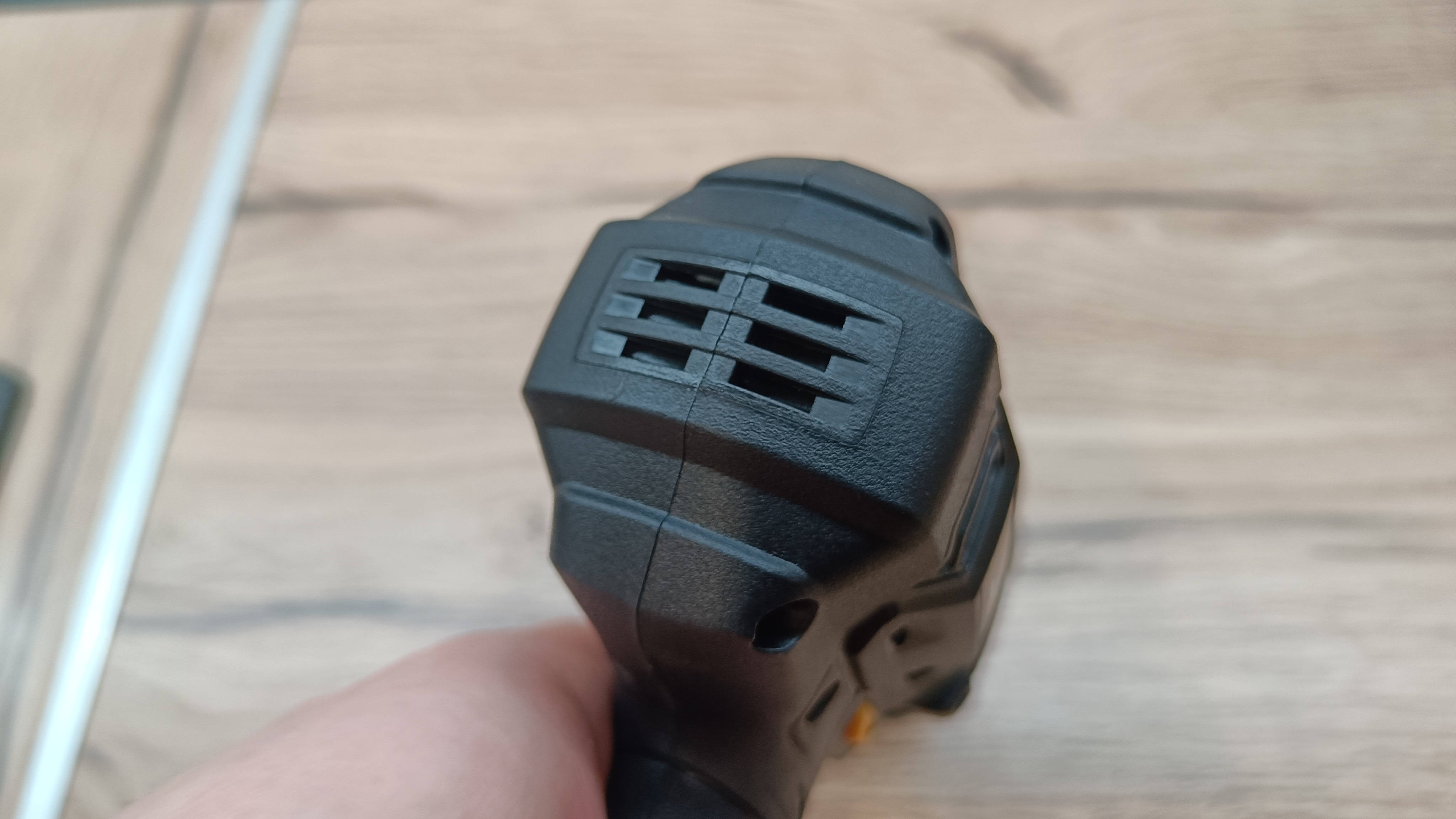 Ручка полностью прорезиненная с рельефным орнаментом. На курке запуска есть резиновая накладка. В руке шуруповерт лежит уверенно, можно использовать без перчаток.