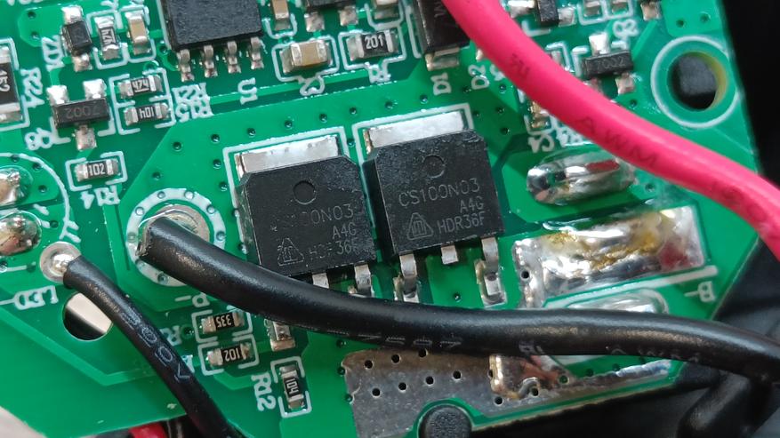 Шуруповерт оказалось разобрать чуть сложнее. Большое количество саморезов удерживают половинки без видимых зазоров. На ручках видна толстая резиновая накладка. Даже при длительной работе она не слезет, так как проникает внутрь корпуса для более надежной фиксации. Приемные контакты из магнитного материала. Тут же можно увидеть плату управления питанием, построенную на двух силовых транзисторах sc100n03. Максимальная мощность до 100 Вт, а напряжение до 30 В. Также в документации по этим мосфетам указано, что максимальный ток может достигать 100А, а температура до 175 градусов.