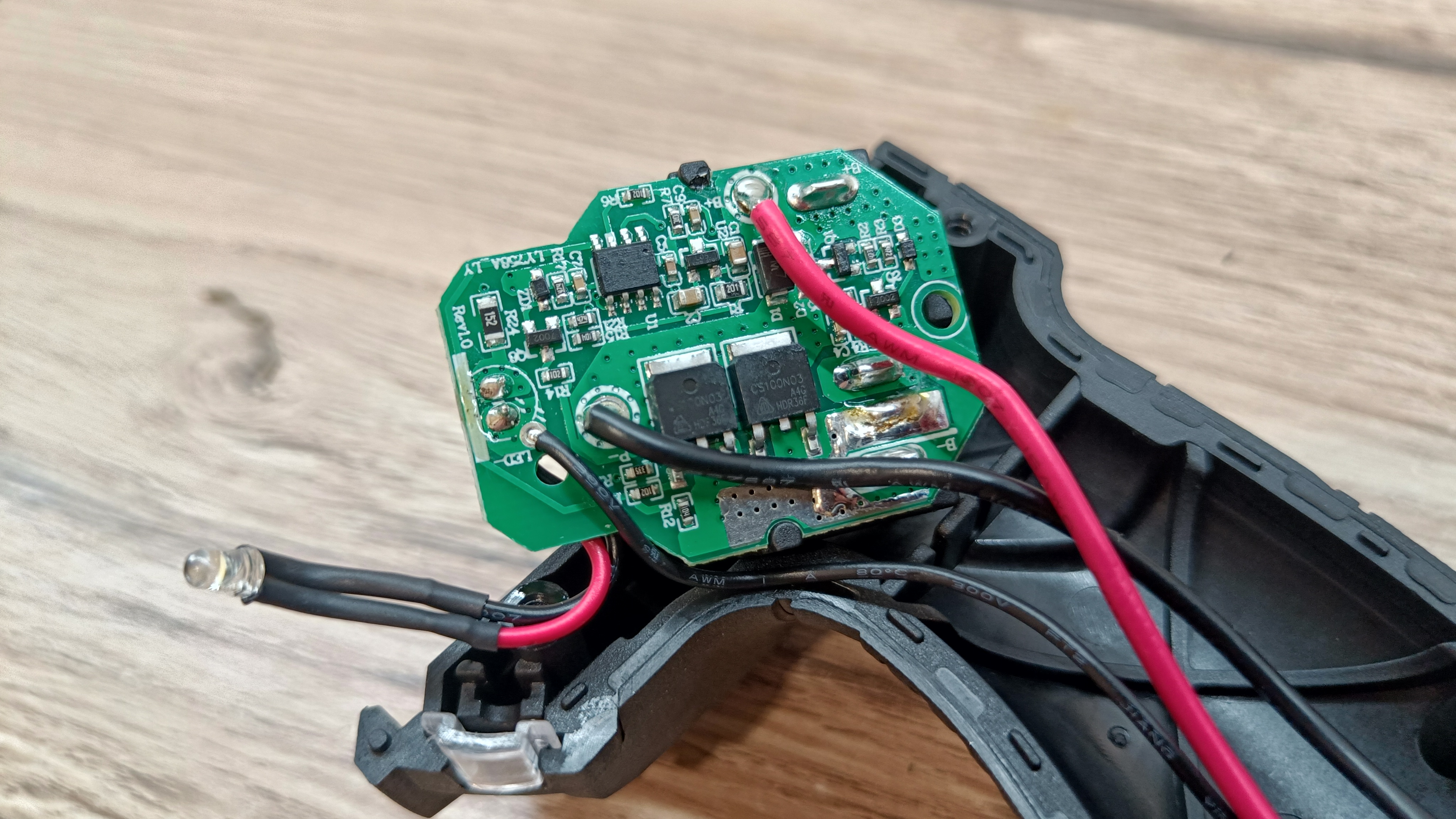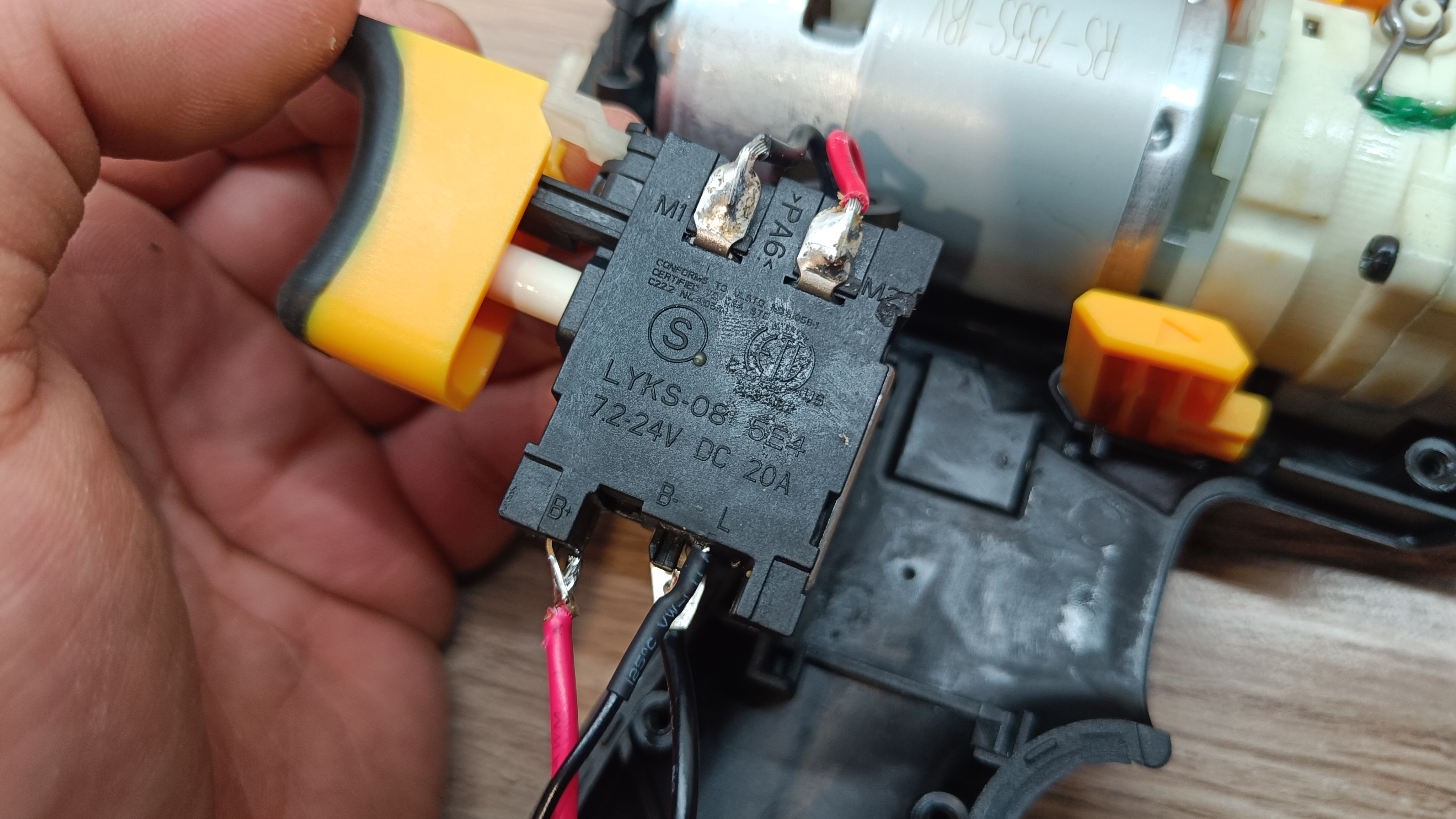Выше кнопка управления запуском. Есть плавный пуск и это удобно при сверлении или закручивании саморезов различной длины. Кнопка с большим алюминиевым радиатором. Сборка на пайке. Судя по маркировке, lyks-08 5e4 на рабочей кнопке максимальный ток до 20А, а напряжение до 24 В. На питающих проводах сразу несколько ферритовых колец.