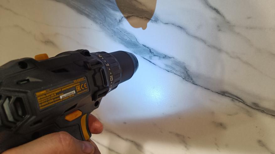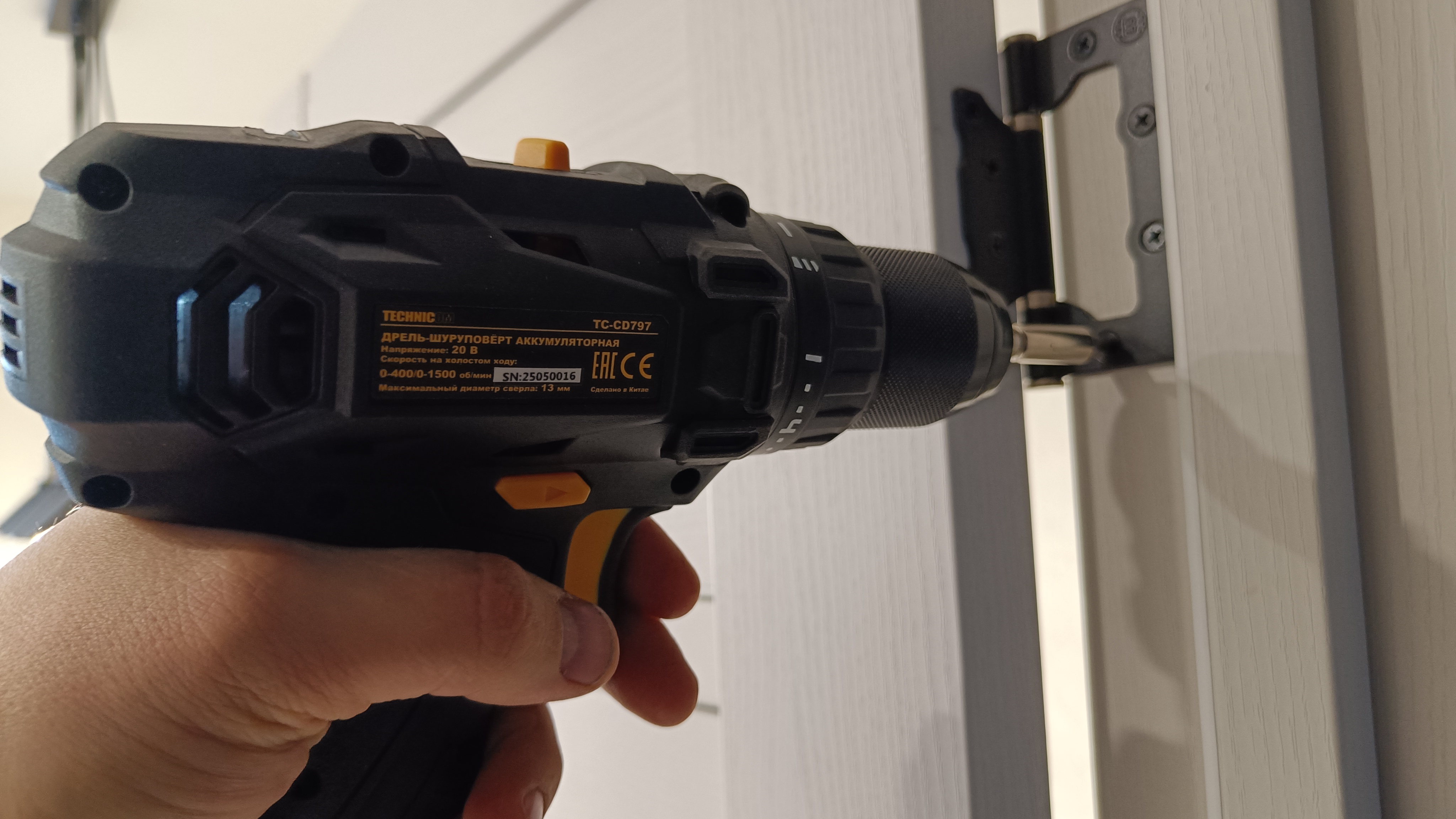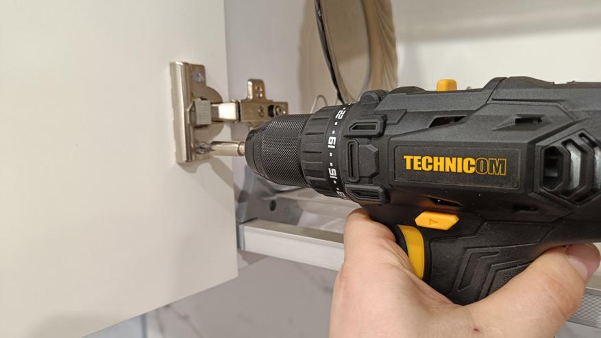 За время использования успел сменить на кухонном гарнитуре «уставшие» доводчики на новые и новые дверные петли. На все это ушло считанные секунды, так как откручивает и закручивает шуруповерт TECHNICOM TC-CD797 очень уверенно.