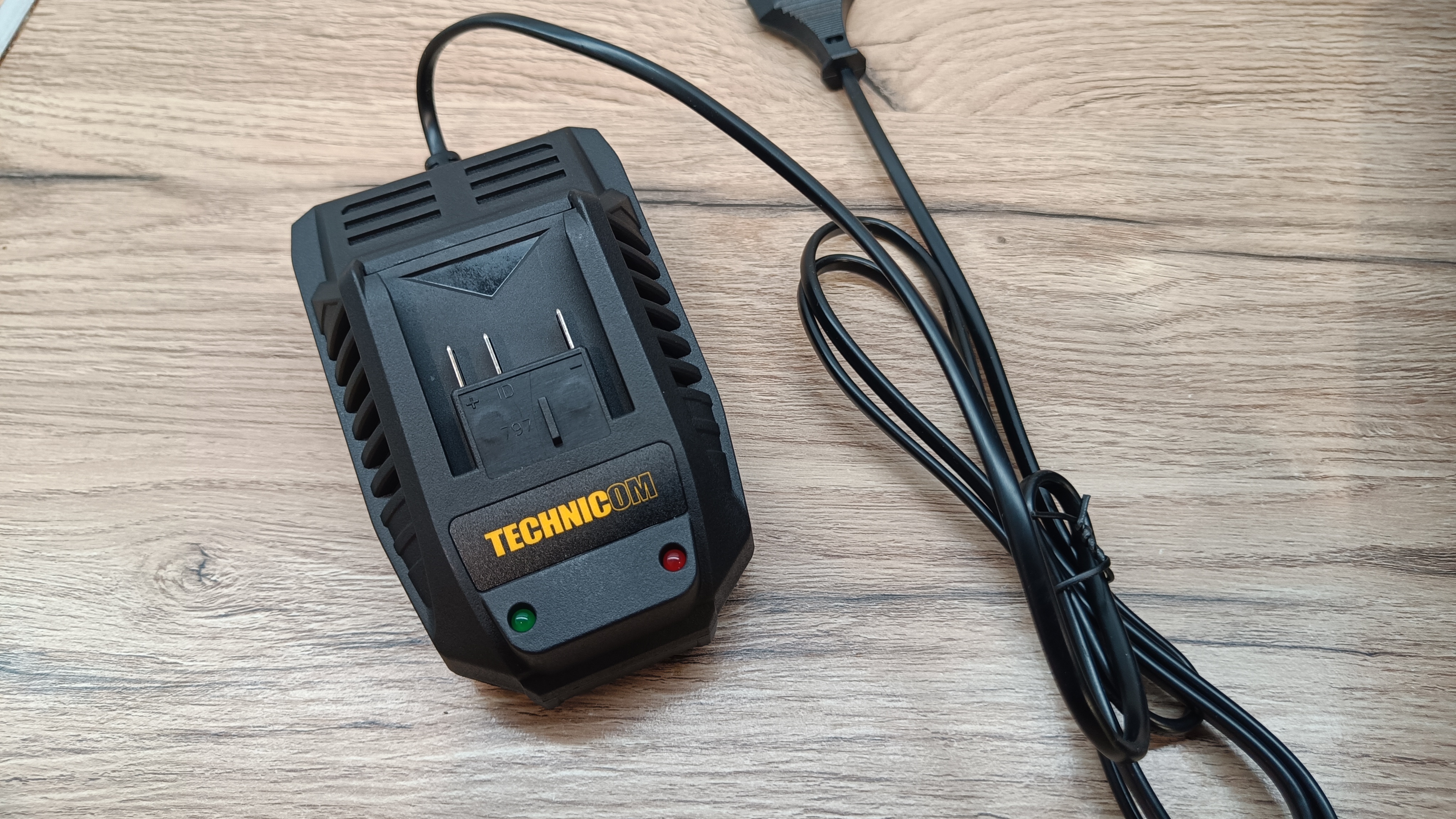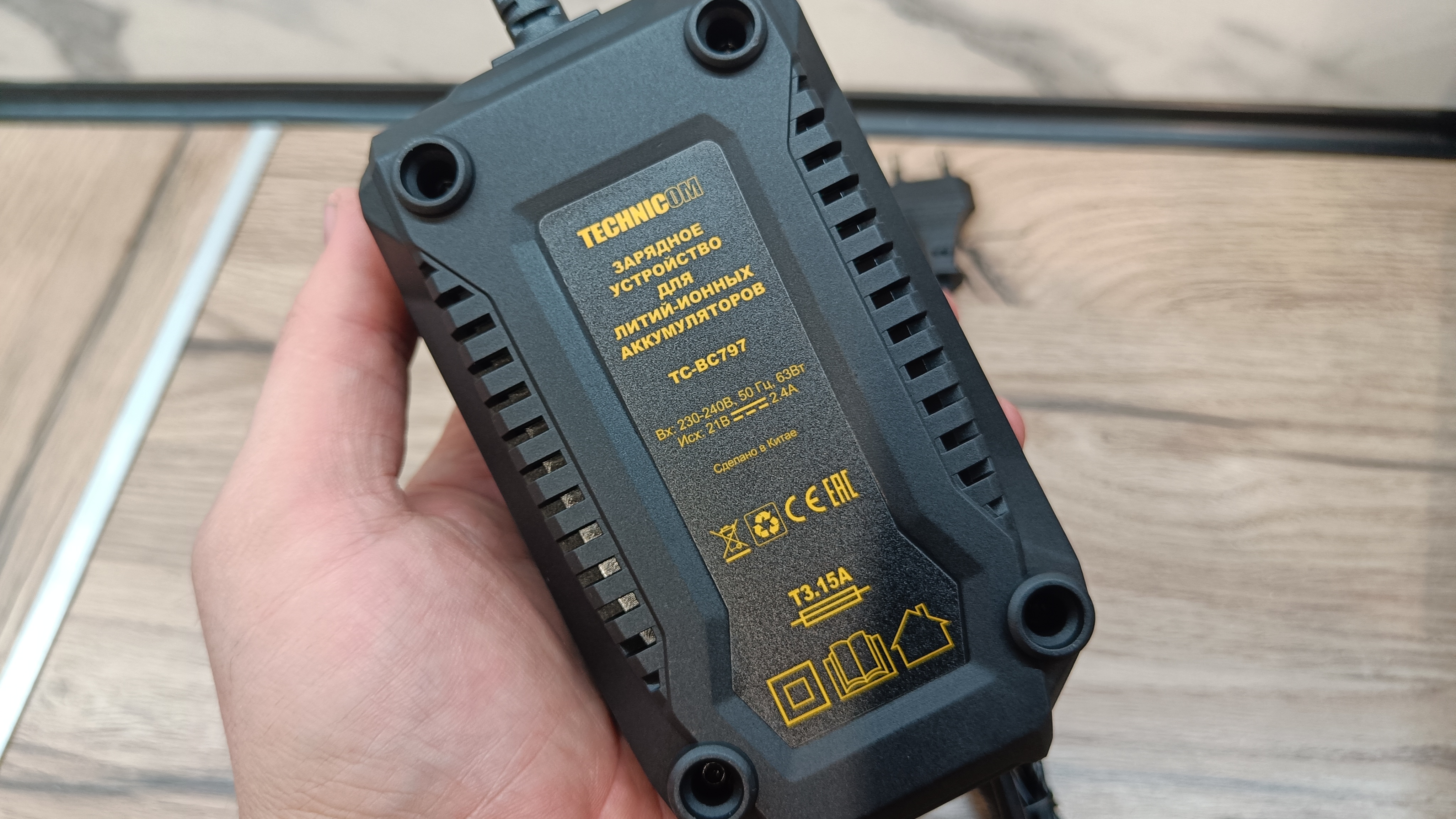 Зарядное устройство отдельным блоком со станцией. Индикация зарядки с помощью световой индикации зеленого и красного цвета. Провод длиной около 1.5 метров. На выходе 21 В и 2,4А.