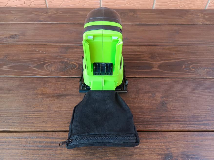 Кнопка включения/выключения расположена спереди и прикрыта пылезащитной прозрачной силиконовой накладкой. Сзади находится крепление с контактами для установки батареи и отверстие для отвода пыли, к которому присоединяется пылесборный мешочек. В нижней части находится подвижная платформа с накладкой из вспененного материала и отверстиями для отвода пыли.