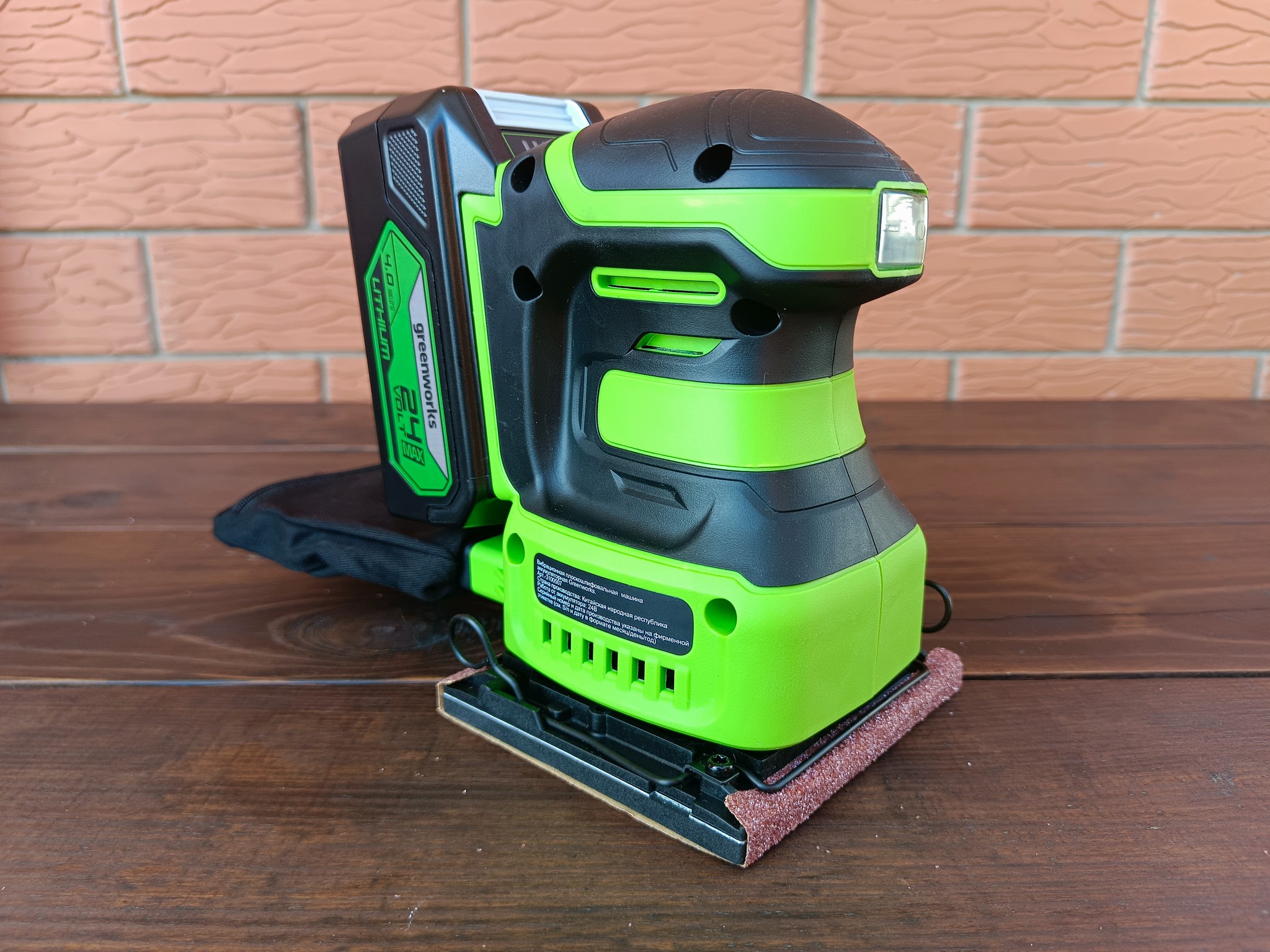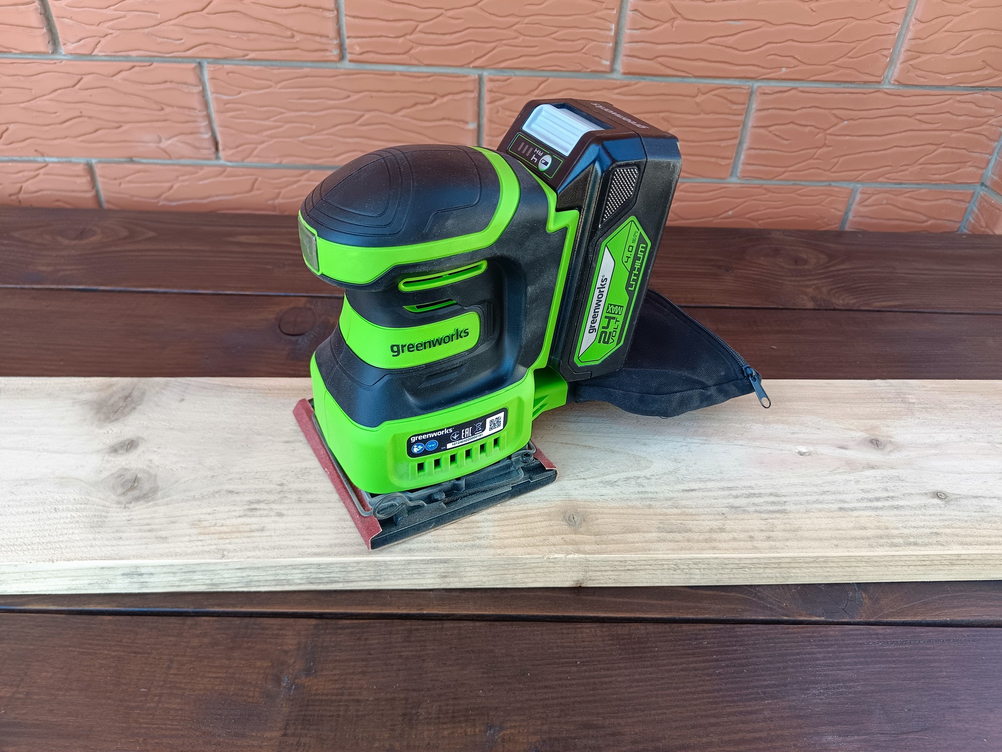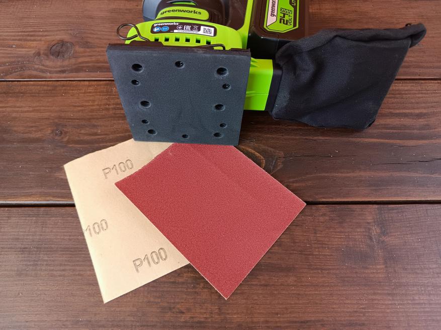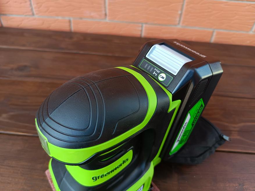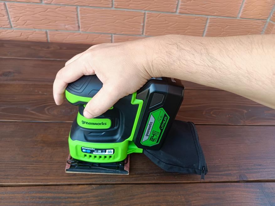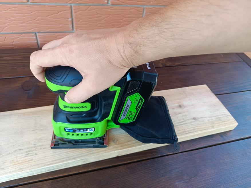 Greenworks G24SS14 оказался весьма неплохим устройством для домашнего использования. Наличие эффективной системы сбора пыли и отсутствие сетевого провода не только сказывается на банальном удобстве, но и позволяет относительно комфортно работать со шлифмашинкой при обработке стен и потолков и даже там, где в принципе нет электрической розетки.
