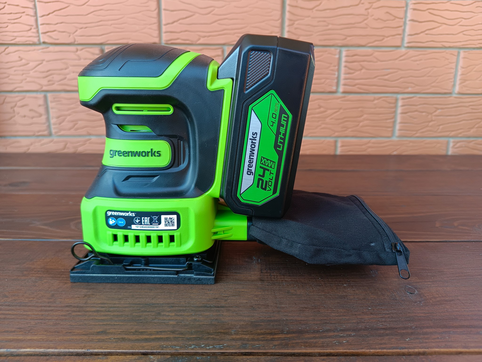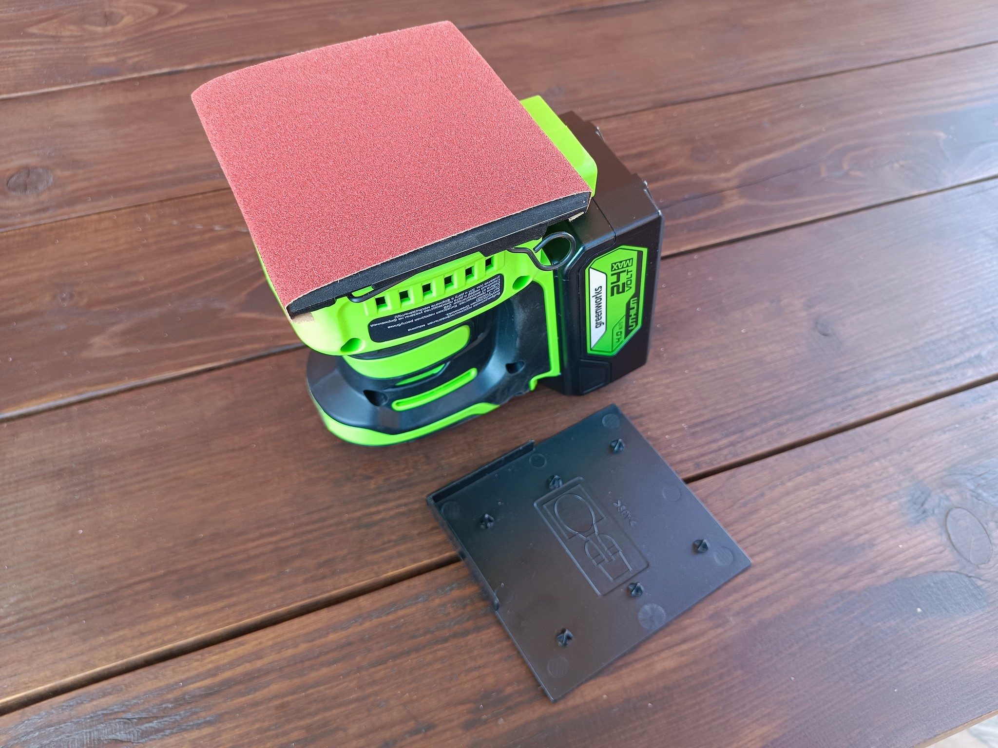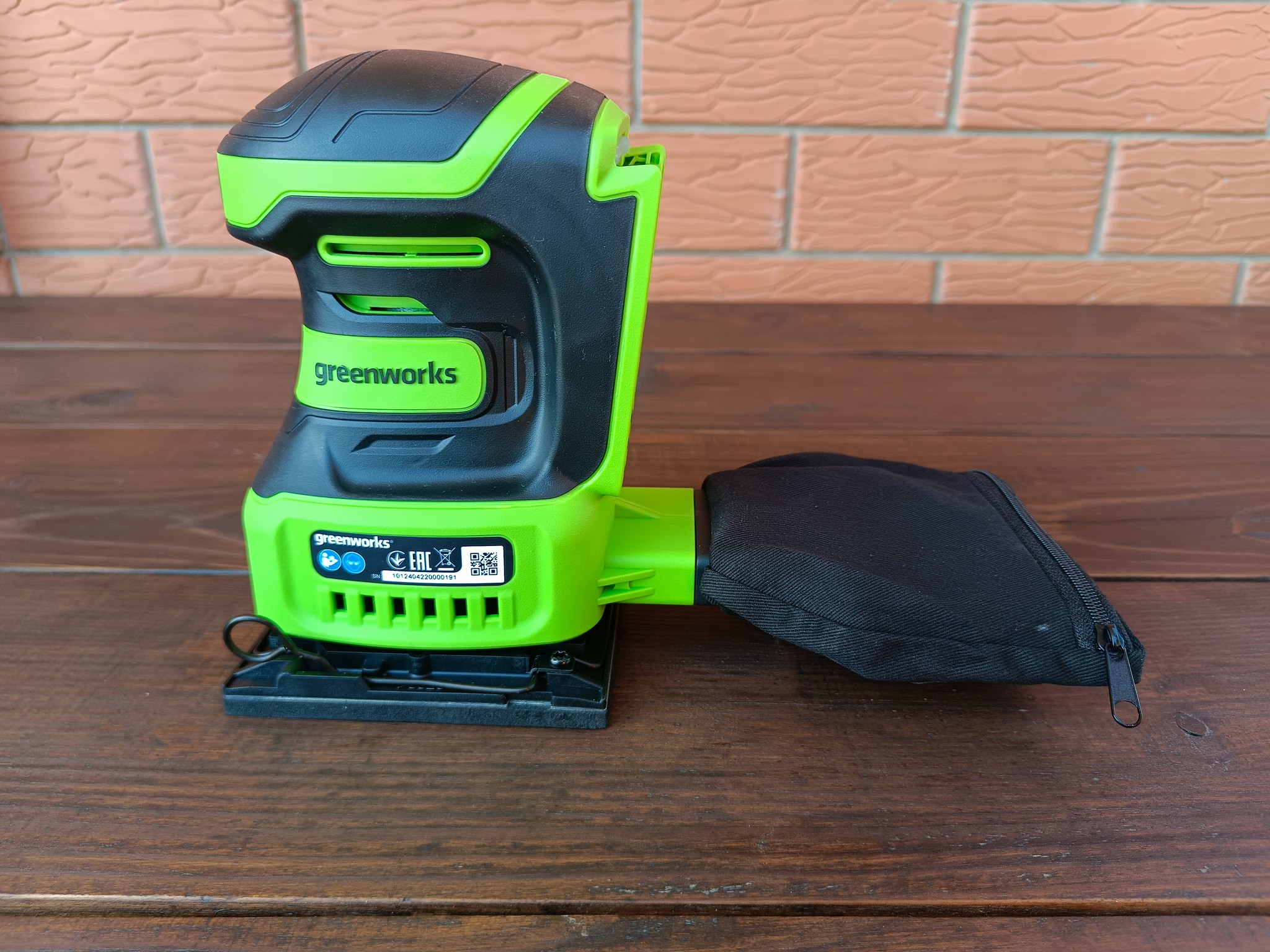 Greenworks G24SS14 оказался весьма неплохим устройством для домашнего использования. Наличие эффективной системы сбора пыли и отсутствие сетевого провода не только сказывается на банальном удобстве, но и позволяет относительно комфортно работать со шлифмашинкой при обработке стен и потолков и даже там, где в принципе нет электрической розетки.