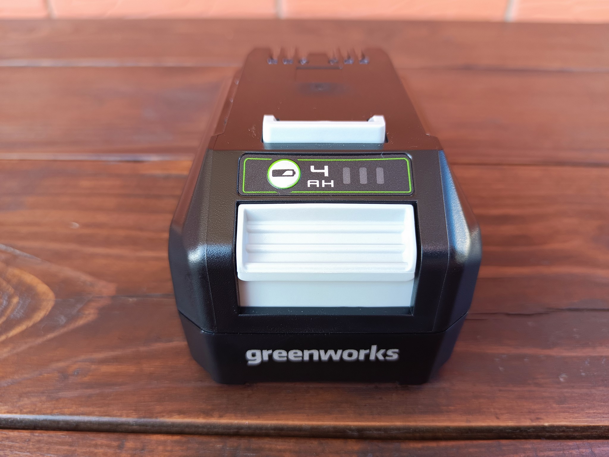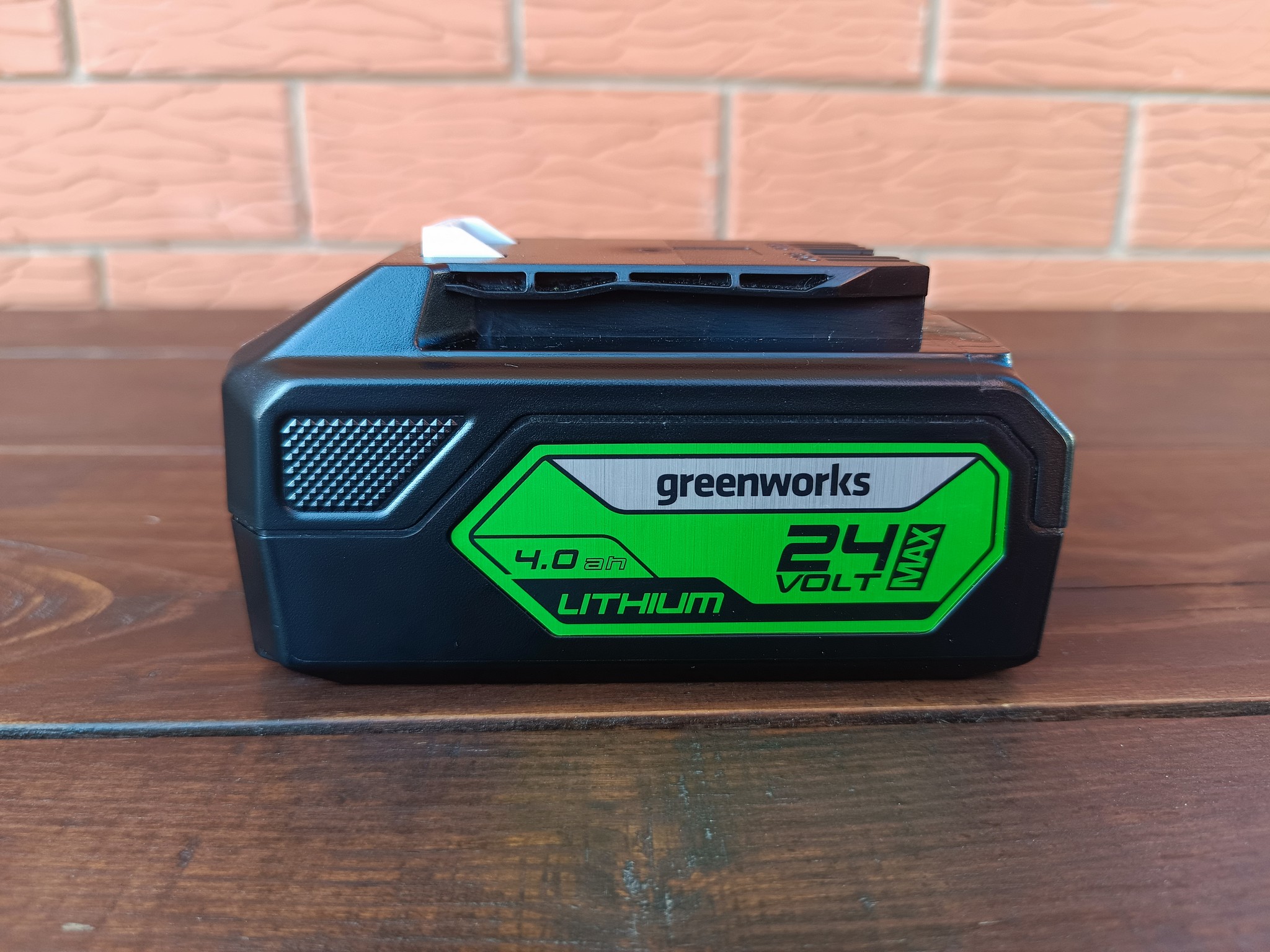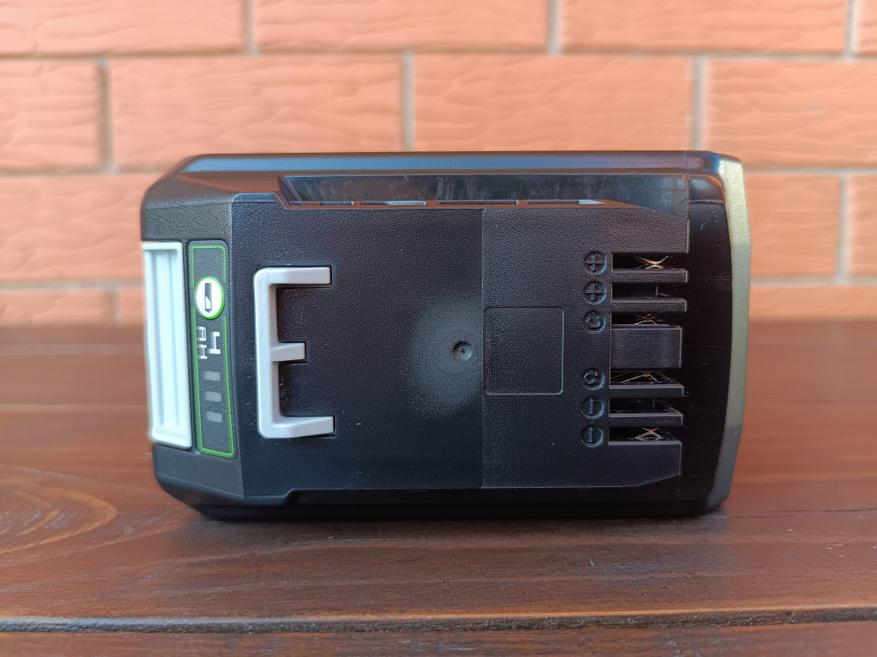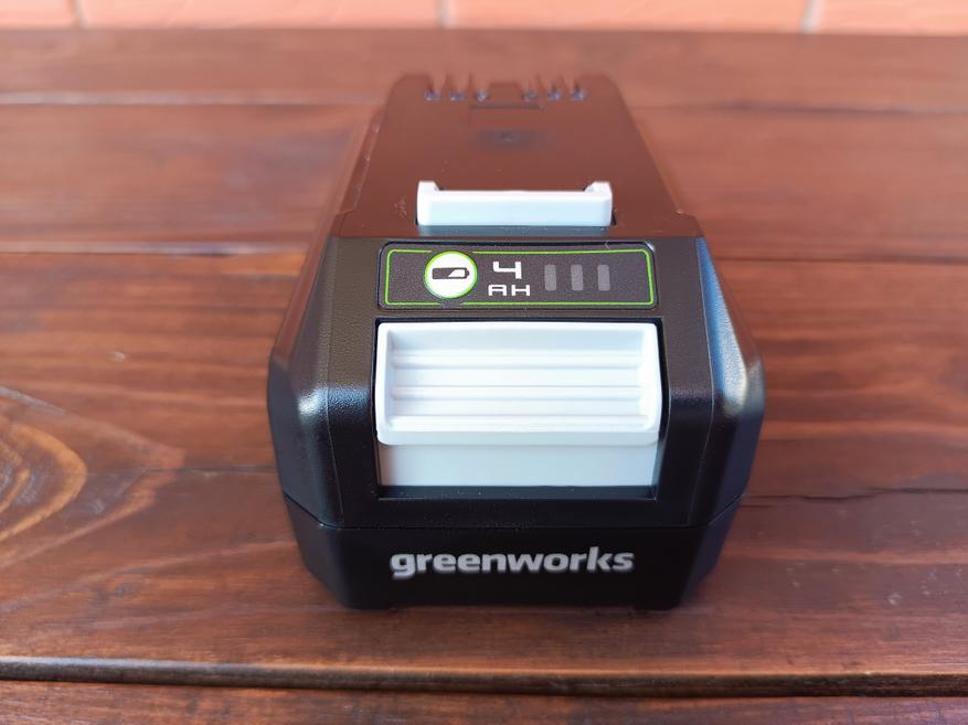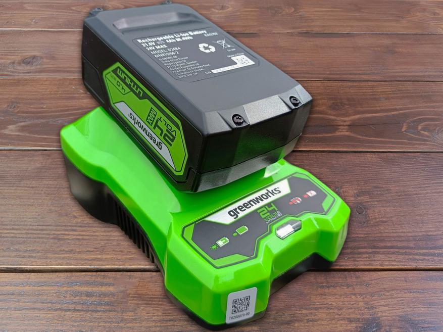 Как уже упоминалось, батарея и зарядное устройство необходимо приобретать отдельно. В данном случае у нас литий-ионная аккумуляторная батарея Greenworks G24B4 с заявленной ёмкостью 4Ач из универсальной линейки Greenworks G24, которую можно использовать совместно со всеми 24-вольтовыми инструментами данного бренда. Остаток заряда здесь можно проверить с помощью встроенного индикатора, а вес батареи составляет 950 грамм.