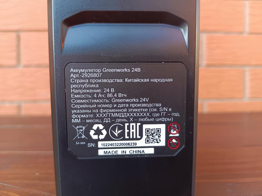 - Серия аккумулятора: Greenworks G24, Li-Ion 24 В;