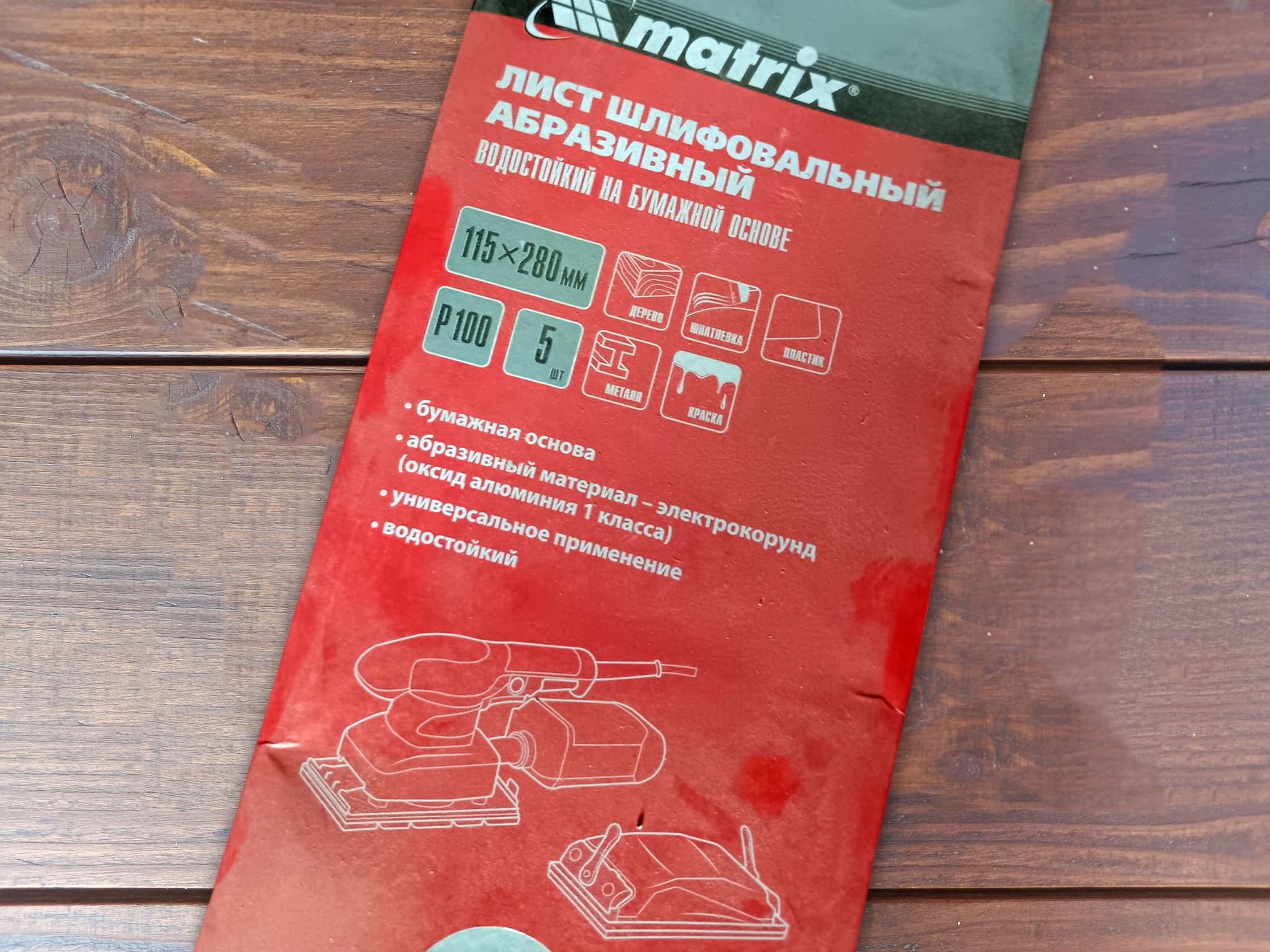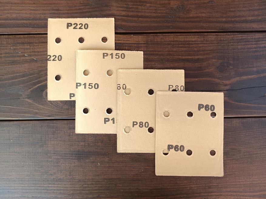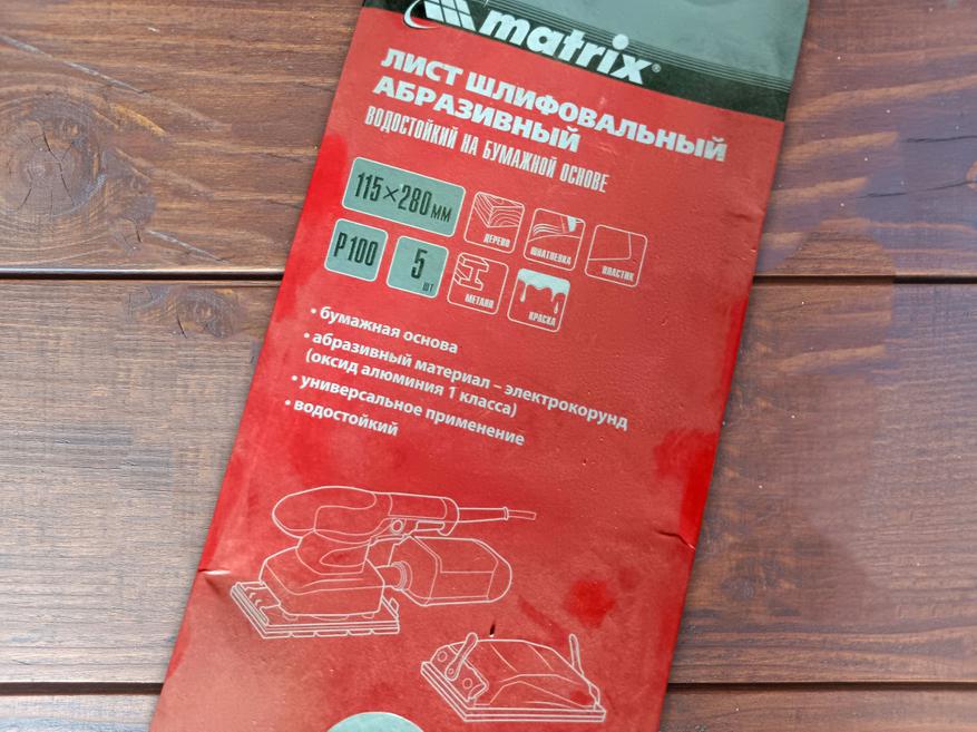 Если нет желания искать в продаже специальную наждачку нужного размера с уже готовыми отверстиями, можно купить обычную, хоть из рулона. Например для меня удобно покупать вот такой комплект из пяти листиков размером 115х280 мм. Сворачиваем листик пополам, разрезаем и получаем два листика для нашей шлифмашинки.
