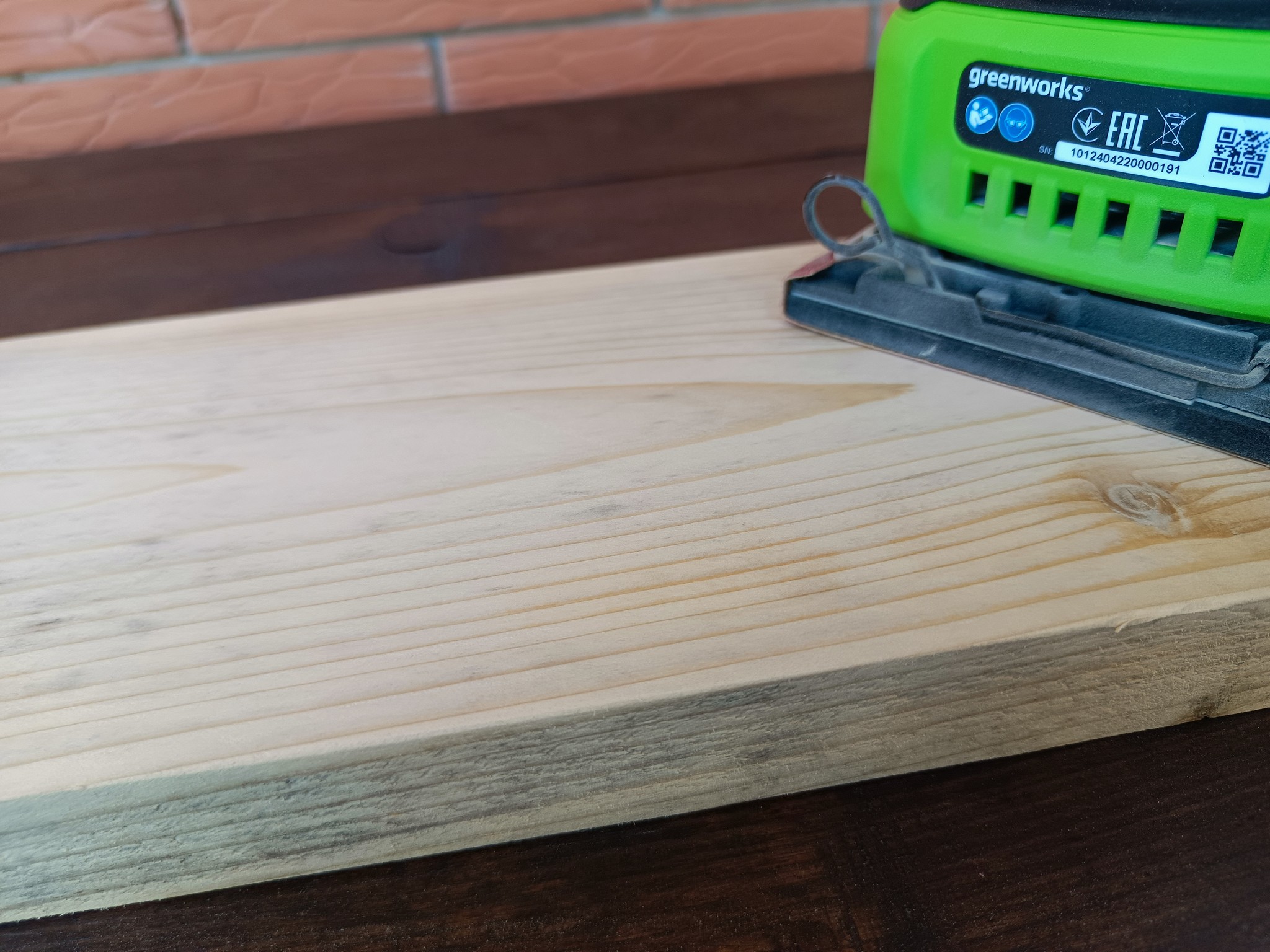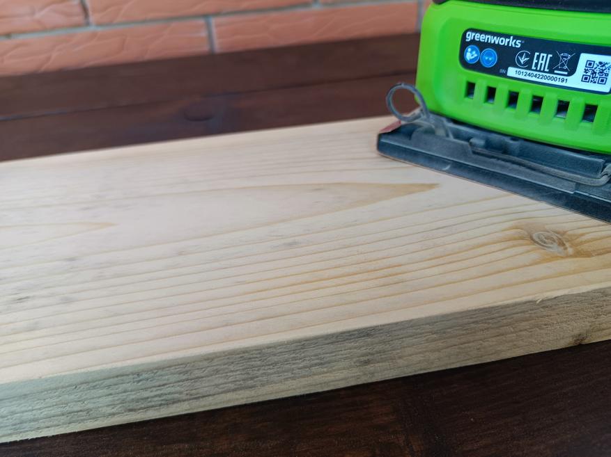 Я использую вибрационную шлифмашинку для зачистки заготовок для различных домашних поделок, поэтому сразу проверим Greenworks G24SS14 в работе. Шлифуем несколько досок, при этом не нужно производить никаких активных действий, просто включаем и не торопясь водим машинку по поверхности без особого нажима. По завершении работы, почти вся древесная пыль собирается в пылесборнике сохраняя одежду «оператора» чистой.