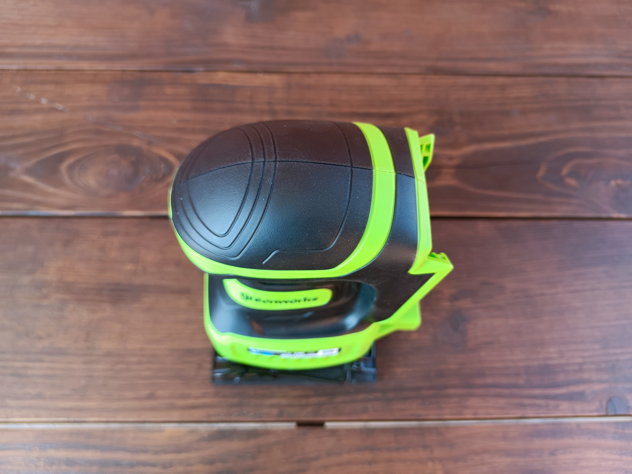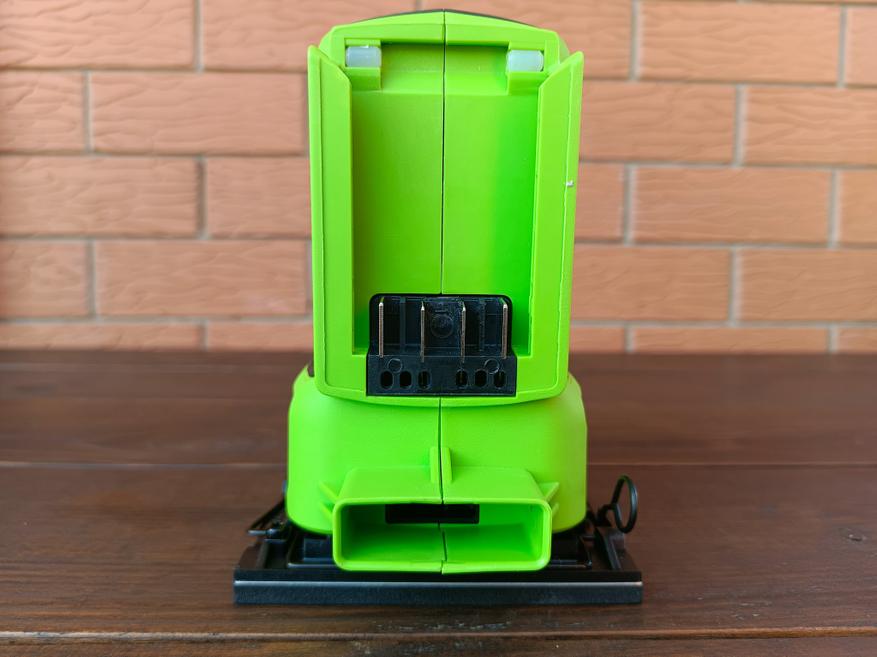 Корпус Greenworks G24SS14 симметричный, выполнен из пластика с прорезиненными противоскользящими вставками, грибовидная форма верхней части позволяет крепко удерживать устройство одой рукой. Внутри здесь расположен щёточный двигатель, работающий с частотой до 11 000 колебаний в минуту, амплитуда хода платформы при этом составляет 1.6 мм. Без установленной батареи вес модели составляет около 1.5 кг.