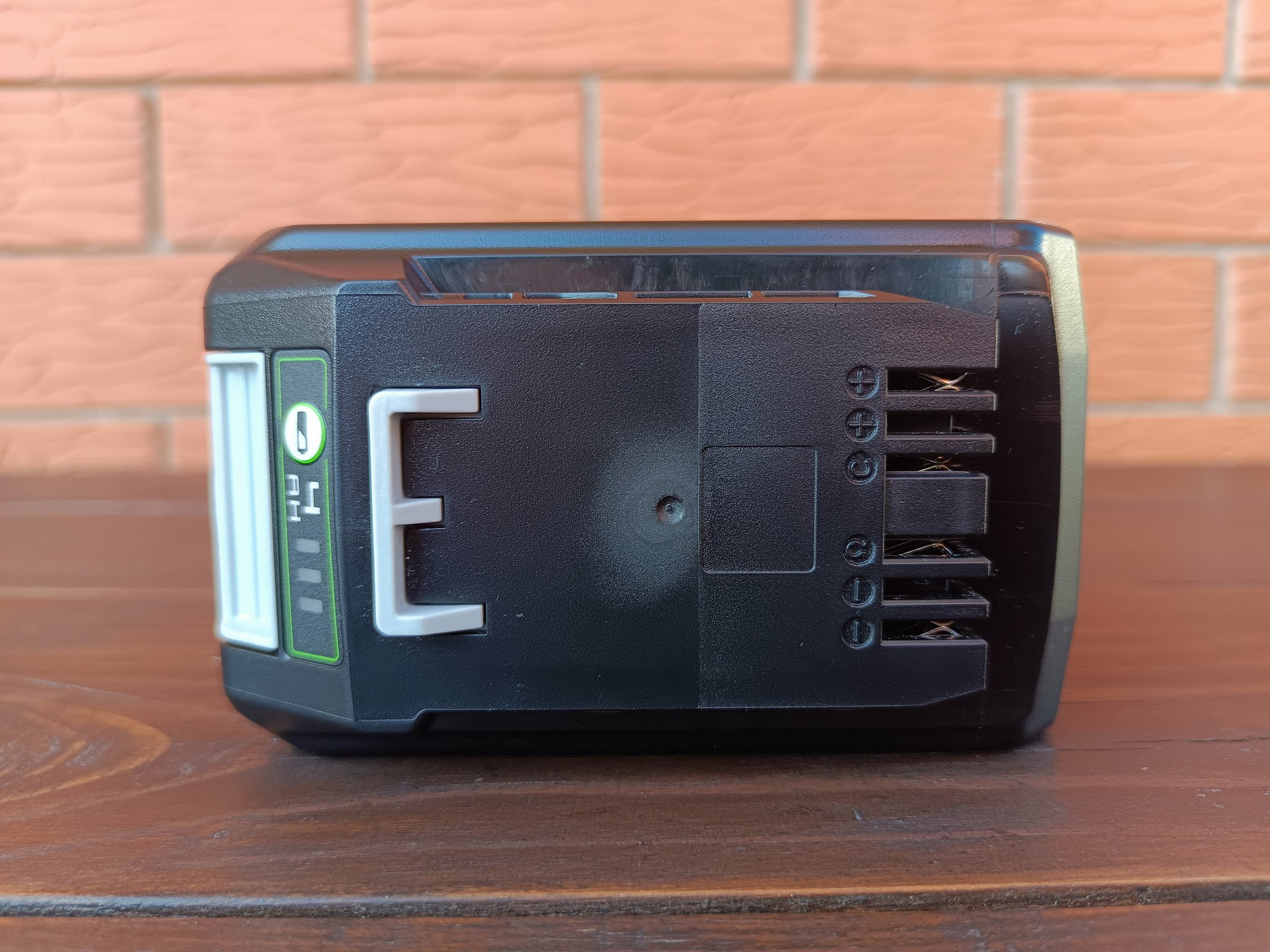 Для зарядки аккумулятора я использую устройство Greenworks G24C. Для индикации процесса заряда используется крупный яркий зеленый светодиод, который мигает в процессе зарядки, а по её завершении просто горит.