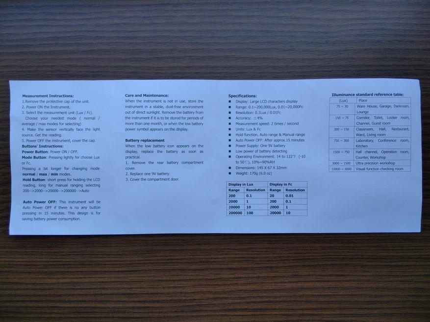- Диапазон измерения: 0,1 ~ 200,000Lux; 0,01 ~ 20,000Fc