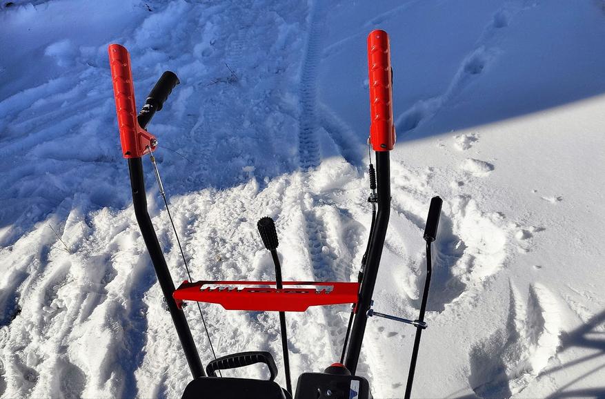 Рукоятки торчат сзади немного вверх, а рычаги регулировки оборотов двигателя и шнека выполнены из металла.