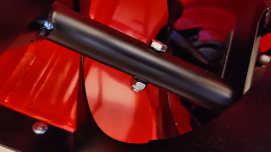 Следующий шаг сборки - это проверка установки и подтяжка предохранительных штифтов на шнековом механизме. Предохранительные штифты нужны для того, чтобы обеспечить аварийное отключение движения шнеков, если внутрь попали какие-то твердые предметы. При жестком ударе о твердый предмет предохранительные штифты обламываются и не передают крутящий момент для вращения шнеков. Изначально на шнеки установили 2 предохранительных штифта, еще 2 запасных предохранительных штифта лежат в комплекте вместе с винтами и гайками. Гайки установки предохранительных штифтов нужно подтянуть.