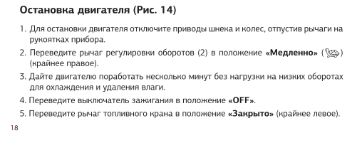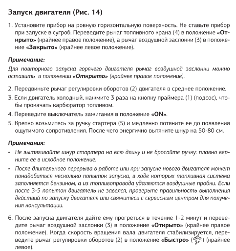Точная последовательность действий для запуска двигателя и дальнейшей эксплуатации поэтапно расписана в инструкции. Не нужно беспокоиться, если у вас не было опыта использования подобной техники. Благодаря качественному подходу составителей инструкции к своему делу, порядок действий понятен даже начинающему пользователю. Прописаны действия для запуска двигателя, остановки двигателя и аварийной остановки двигателя.