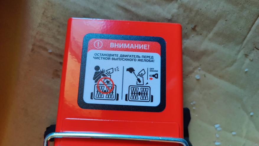 На корпусе желоба выброса снега размещены предупреждающие наклейки о мерах безопасности. Они предупреждают о том, чтобы мы были внимательны и не допускали попадания одежды и частей тела к крутящимся шнекам и проводили чистку выпускного желоба только при остановленном двигателе.