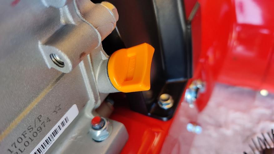 Следующий шаг подготовки — это залив масла. Справа мы видим крышку заливной горловины желтого цвета. Она же имеет функцию щупа. Выкручиваем крышку, наливаем масло. Заливная горловина узкая. Около сантиметра в диаметре, и расположена под углом. Так просто из канистры налить сложно, но можно легко свернуть воронку из бумаги или воспользоваться реальной воронкой с узким изливом.