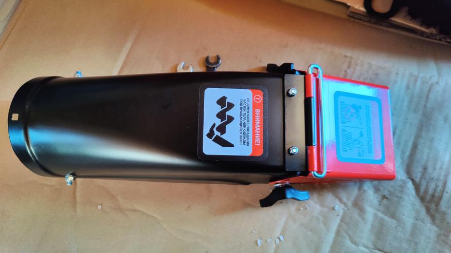 Желоб для выброса снега выполнен целиком из металла. Он состоит из 2 частей: жестко установленного желоба и регулируемой крышки для выбора угла выброса снега. Внутри желоба подпружиненный механизм для разбивания выброшенных крупных частей снега или льда.