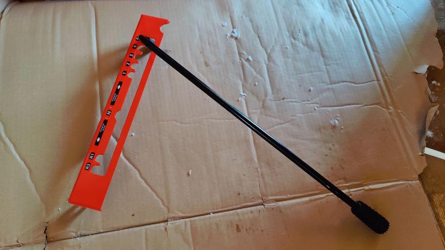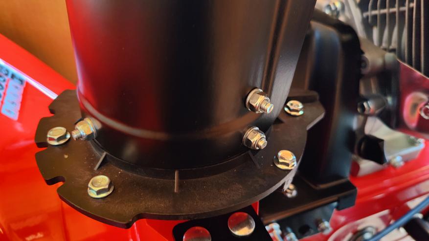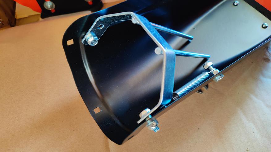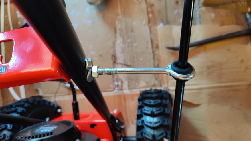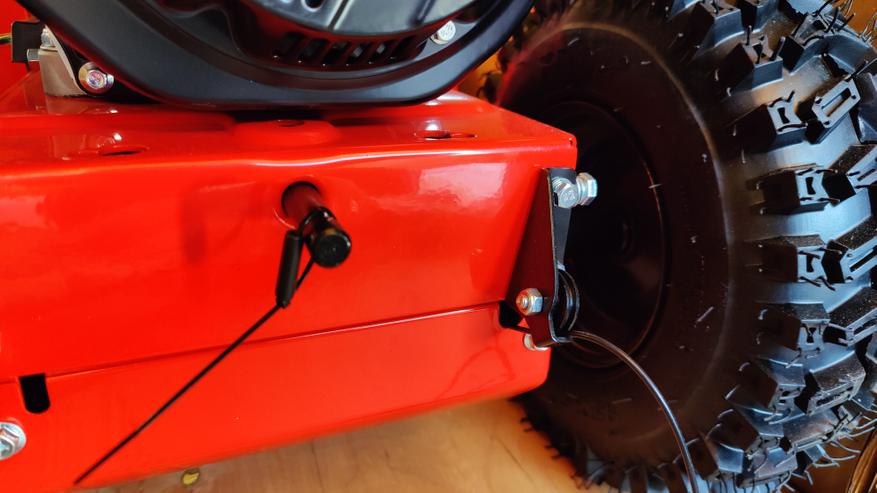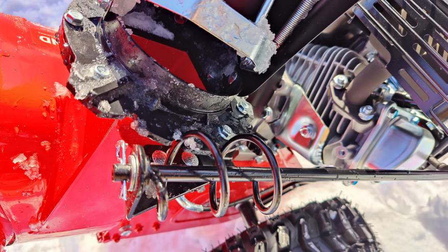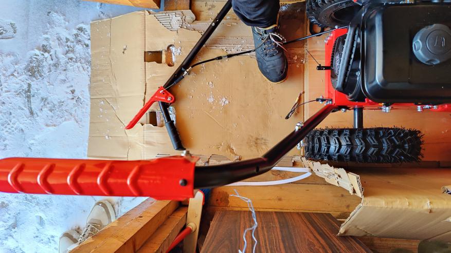 Следующий шаг это крепление рукоятки регулировки угла поворота выпускного желоба. Устанавливаем конец рукоятки на положенное место, фиксируем стопором и сверху прикручиваем при помощи специальной тяги к левой рукоятке. Благодаря такому выборному методу фиксации, рукоятка перемещения угла поворота желоба зафиксирована жестко и при помощи пружинной части и вырезов в желобе перемещает поток выбрасываемого снега на нужный вам угол.