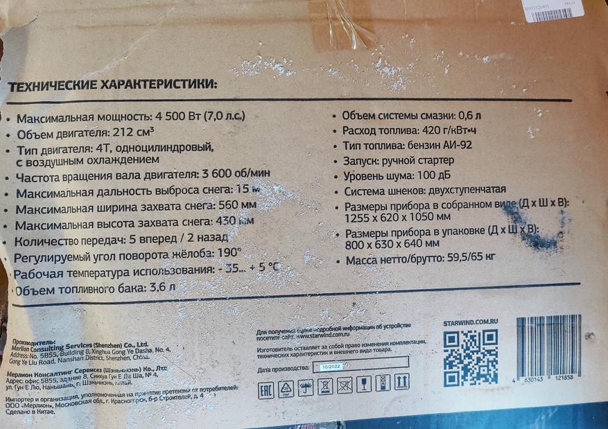 Так как в наличии в магазине не было, заказали с доставкой, и сразу привезли в гараж на место сборки. Поставляется снегоуборщик в плотной картонной коробке, внутри картонные втулки и полиэтиленовые пакеты. Изначально думал, что доставить и загрузить снегоуборщик будет тяжело, пугала большая коробка и вес. Но на деле, коробка компактная, а вес 65 кг, в принципе можно осилить одному, ну а уж вдвоем вообще удобно. Технические параметры написаны сразу на коробке, также нарисована сама машина в сборе и указаны производитель и модель.