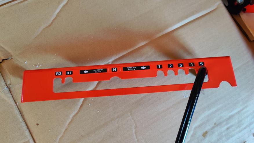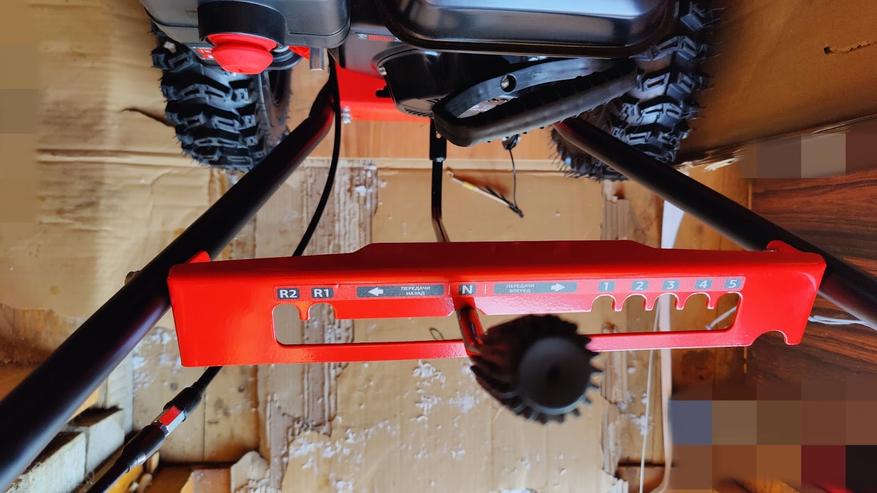 Панель управления представляет собой просто полоску металла, на которой размечены передачи и также есть вырезы для фиксации рычага переключения передач. Как видим, наш снегоуборщик обладает нейтральной передачей, 5 скоростями вперед и 2 скоростями назад.