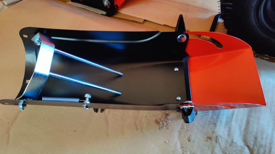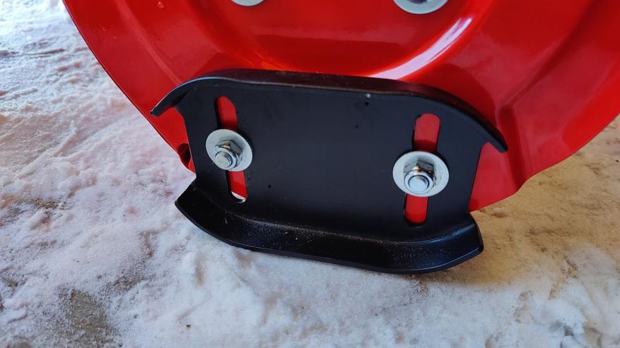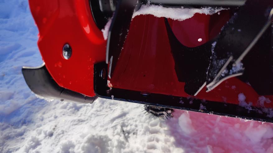 Осталось только отрегулировать впереди на ковше снегоуборщика 2 металлических полоза, для настройки клиренса, то есть глубины убираемого снега. Это делается если участок уборки не абсолютно ровный и нет необходимости снимать снежное покрытие до самой земли или тротуара. Я оставил на среднем уровне. Все детали и ковш снегоуборщика и металлические полозья сделаны из толстого металла и нареканий к сборке нет. Полозья металлические и двухсторонние, если они износятся, их можно будет просто перевернуть.
