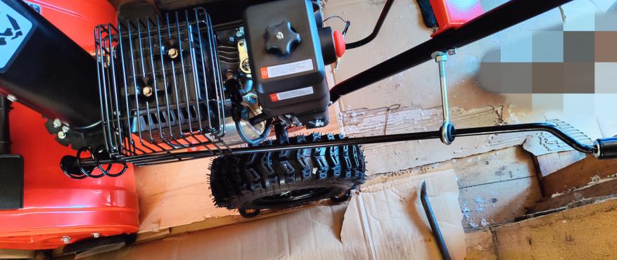 Из коробки машина уже практически собрана, все комплектующие уже находятся в дополнительном пакете, плюс винты и гайки, которые понадобятся для фиксации частей снегоуборщика уже насажены на свои места.