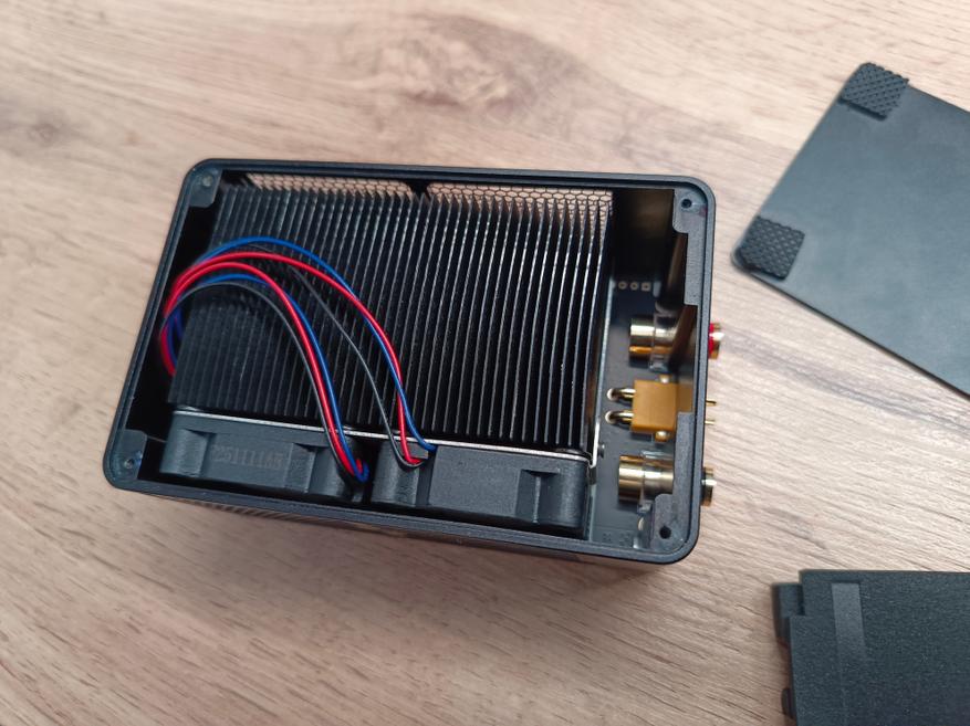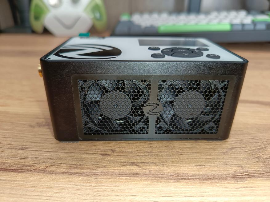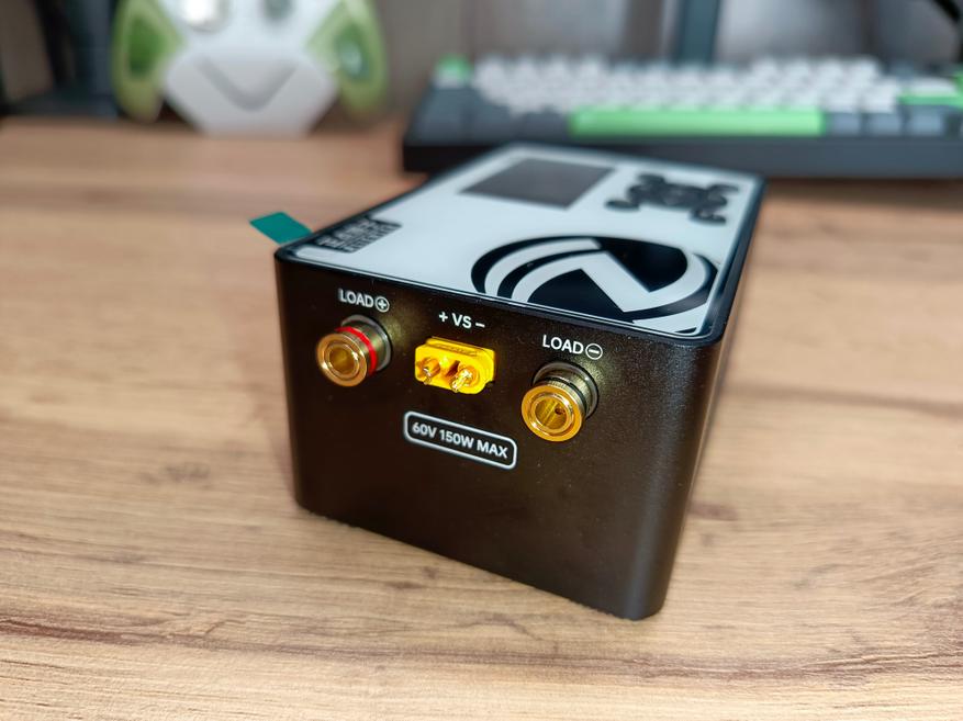По бокам корпуса расположены вентиляционные отверстия, за которыми хорошо виден радиатор системы охлаждения и два вентилятора. С одного торца находится разъём для подключения питания, а с противоположной стороны размещены две клеммы под «бананы», а также силовой разъём XT60. Именно такими разъёмами оснащается большинство устройств со съёмными аккумуляторными батареями, что делает тестер универсальным и удобным в использовании.