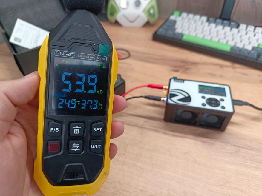 Уровень шума при работе вентиляторов повышается до 54 дБ. Работать за столом в непосредственной близости от устройства, когда вентиляторы включены, не очень комфортно. Однако если отойти на пару метров, шум уже становится вполне терпимым, а из соседней комнаты он практически не слышен и не мешает работе.