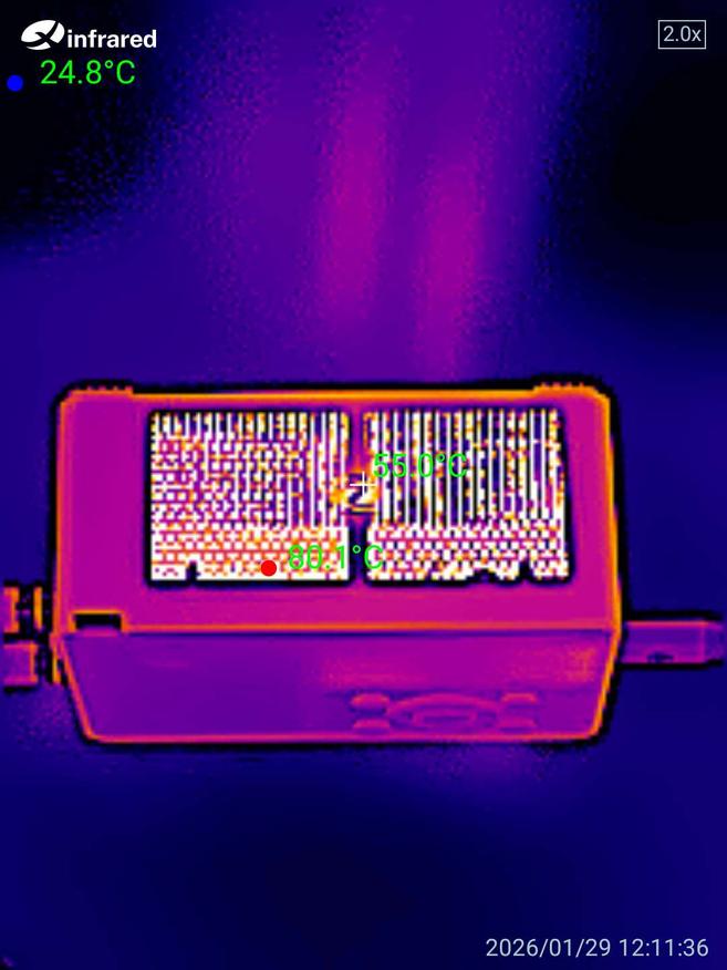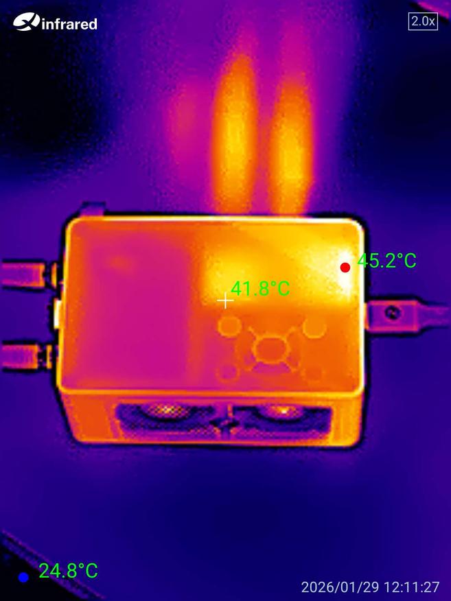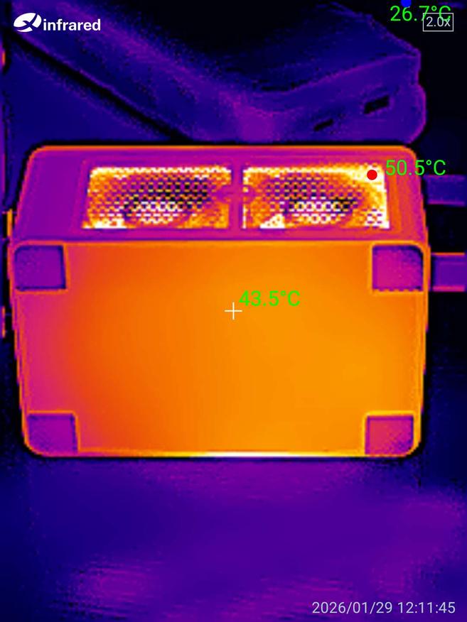 Снимки, сделанные тепловизором во время работы устройства под нагрузкой 150 Вт, показывают, что температура корпуса в среднем составляет около 45-50 градусов. Это говорит об эффективной системе охлаждения и отсутствии критического перегрева даже при длительной работе на высокой мощности.