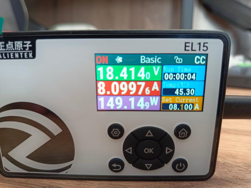 Информация на дисплее отображается наглядно и понятно, без лишних элементов, что делает работу с устройством комфортной. Управление также реализовано достаточно просто и интуитивно, однако было бы удобнее, если бы кнопка «Start» была вынесена отдельно. В текущей реализации запуск нагрузки осуществляется кратковременным нажатием кнопки питания, при этом при её удержании устройство полностью выключается.