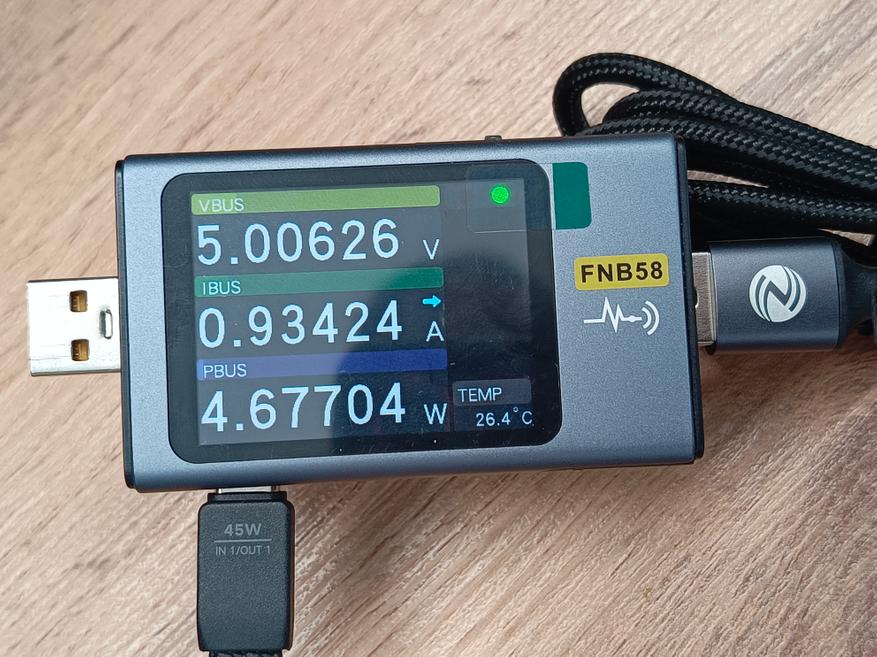 Питается электронная нагрузка от любого USB-порта, при этом потребляемая мощность колеблется в пределах 4-6 Вт. Благодаря этому устройство можно запитать не только от сетевого адаптера, но и от повербанка или смартфона с поддержкой OTG. Такое решение делает нагрузку удобной для использования в полевых условиях, где нет доступа к стационарному источнику питания.