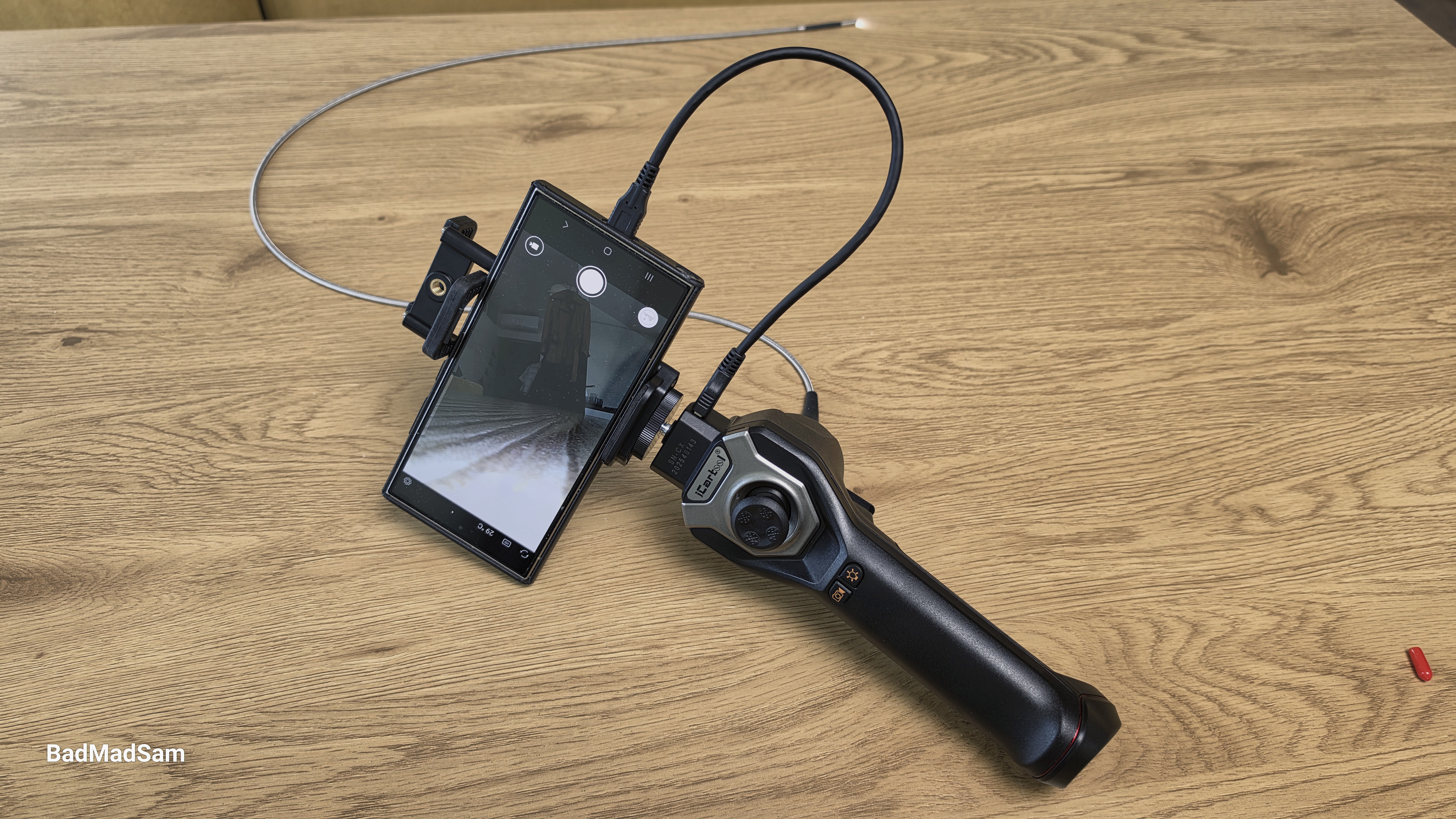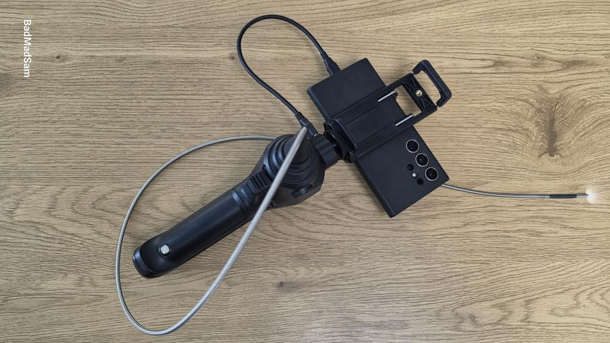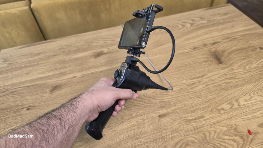 В завершение я провел тест прохождения изгибов. Для этого использовал изогнутый канал и попытался провести зонд за угол, имитируя работу в реальных условиях. В таких сценариях обычные эндоскопы часто требуют повторного ввода — приходится вытаскивать зонд, менять угол и снова пытаться попасть в нужное направление. С iCartool IC-V104AW этого делать не пришлось, подвижный модуль камеры заметно упрощает задачу. Направление можно менять уже внутри канала, не извлекая зонд наружу. Это позволяет аккуратно обойти изгиб и продолжить движение дальше, сохраняя контроль над тем, куда именно смотрит камера, в общем процесс здесь более управляемый.