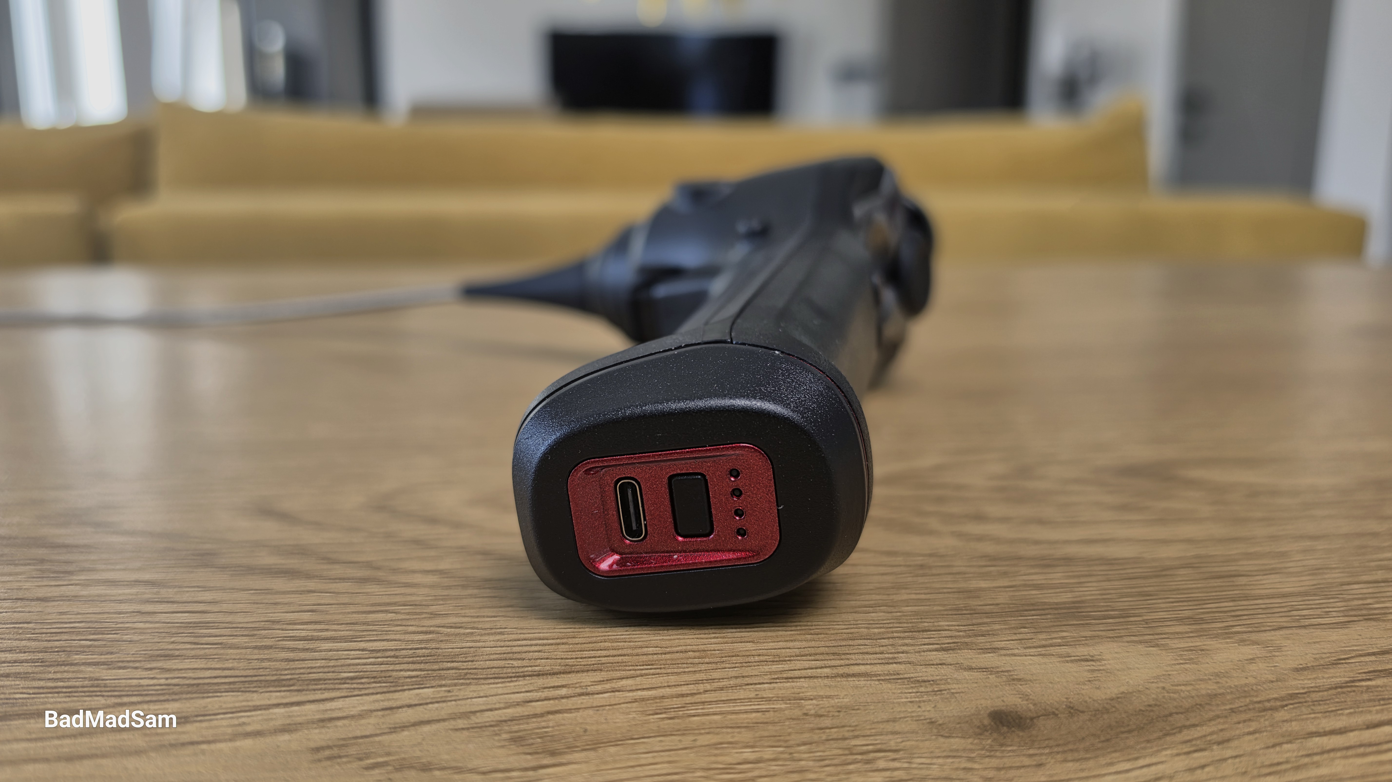 Форма рукояти вытянутая, с небольшим расширением в нижней части. На основании корпуса выделяется тонкая красная декоративная линия. На нижней поверхности расположены разъем зарядки USB-C, кнопка питания и, что неожиданно, индикатор уровня заряда аккумулятора — все для удобства работы. Такое редко встретишь.