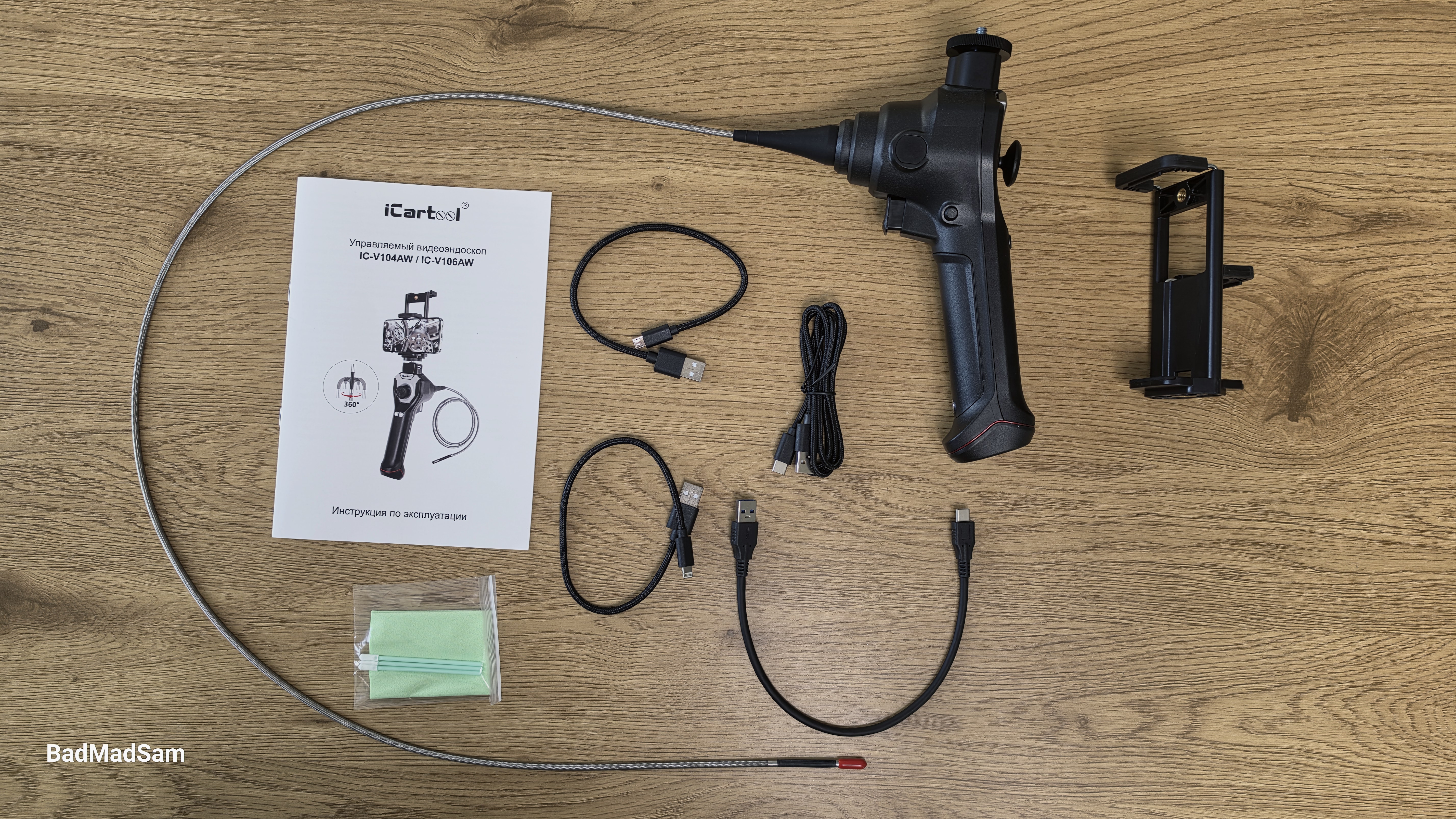 В комплект поставки входит сам видеоэндоскоп с гибким зондом длиной 1 метр, а также набор кабелей для подключения к мобильным устройствам. Подключение: USB, с комплектными коннекторами Type-C / Lightning / micro-USB, поэтому устройство можно использовать как со смартфонами/планшетами на базе Android, так и с устройствами Apple. Также в комплекте есть съемный держатель для смартфона/планшета, который крепится к корпусу прибора. Для обслуживания камеры предусмотрены чистящие палочки и салфетка для очистки оптики. Обязательно загляните в руководство по эксплуатации: там прописаны ключевые правила работы с прибором, условия гарантии и важные нюансы, которые помогут сохранить его в рабочем состоянии.