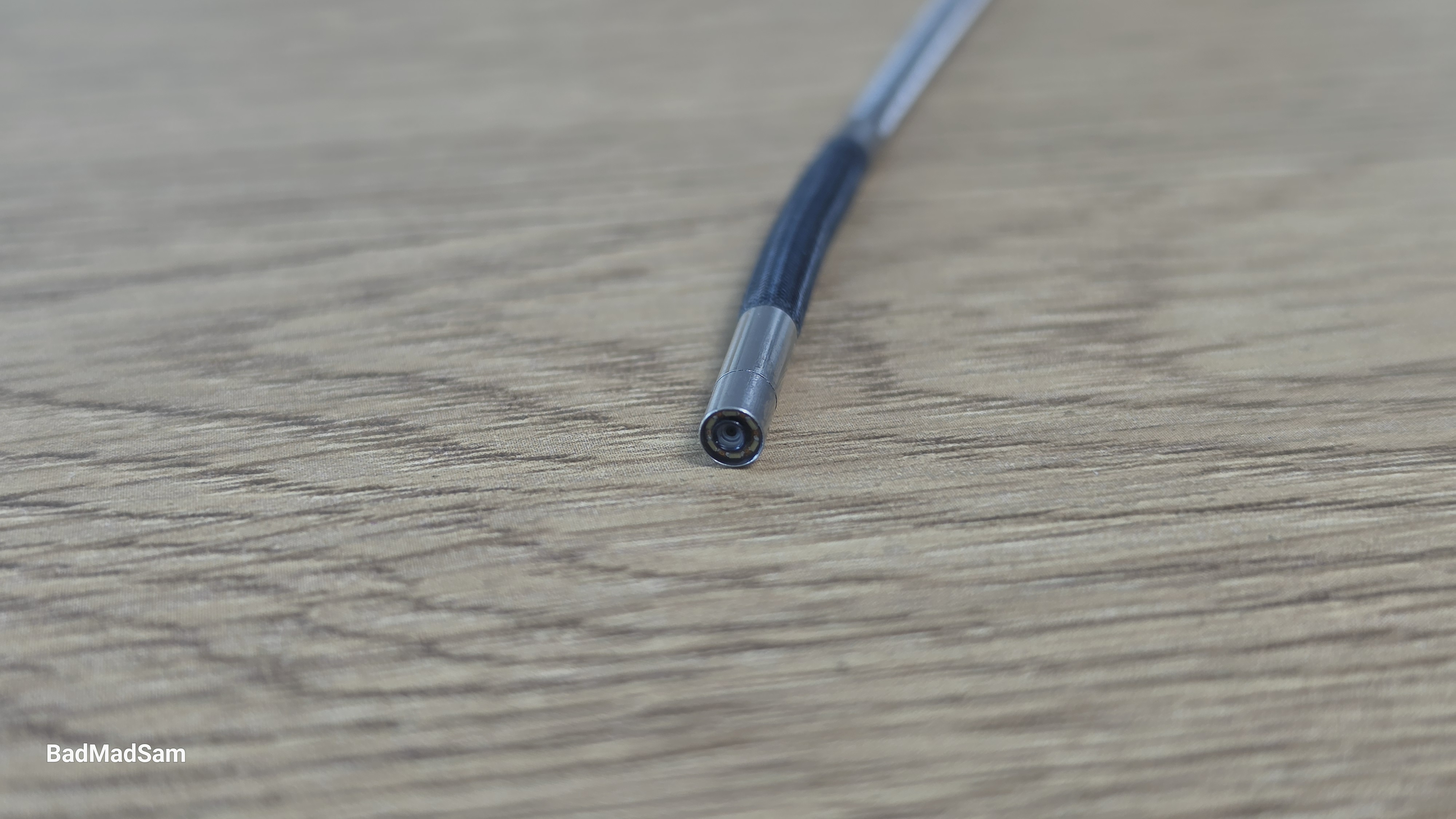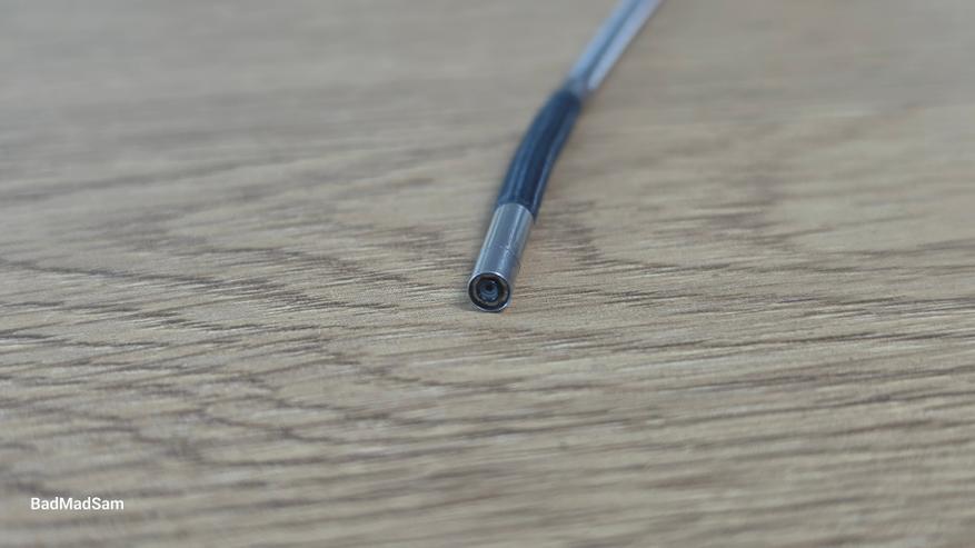 Внешний материал дистальной части зонда выполнен из более темного материала — это износостойкая вольфрамовая сетка. Наконечник компактный, цилиндрической формы, диаметром всего около четырех миллиметров (3.91 мм). По периметру объектива расположены светодиоды подсветки, обеспечивающие освещение исследуемой области. По заявлению производителя, в зоне камеры используется защитное стекло из закаленного материала, что должно повысить стойкость к воздействию масла, бензина и мелким механическим повреждениям.