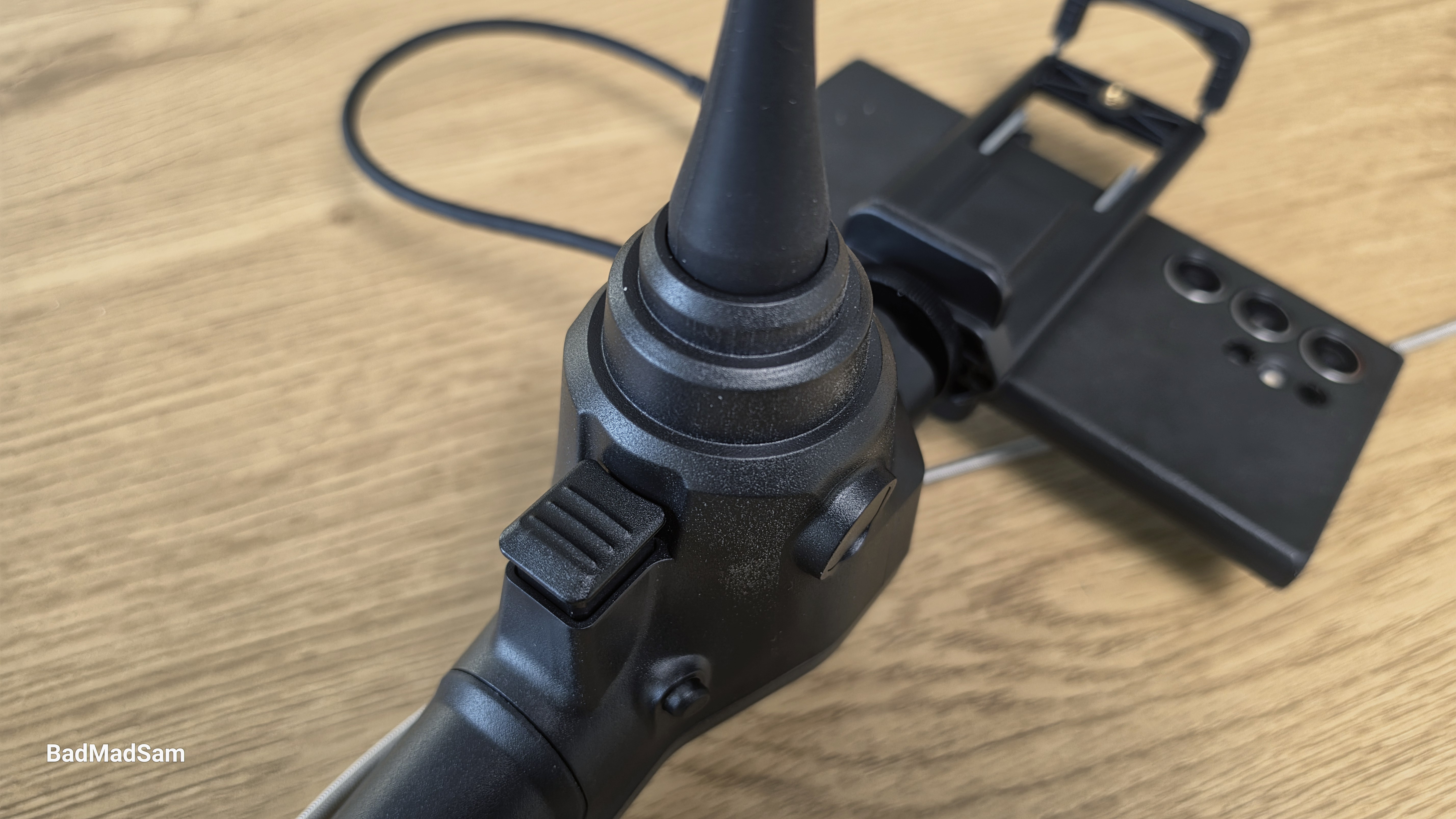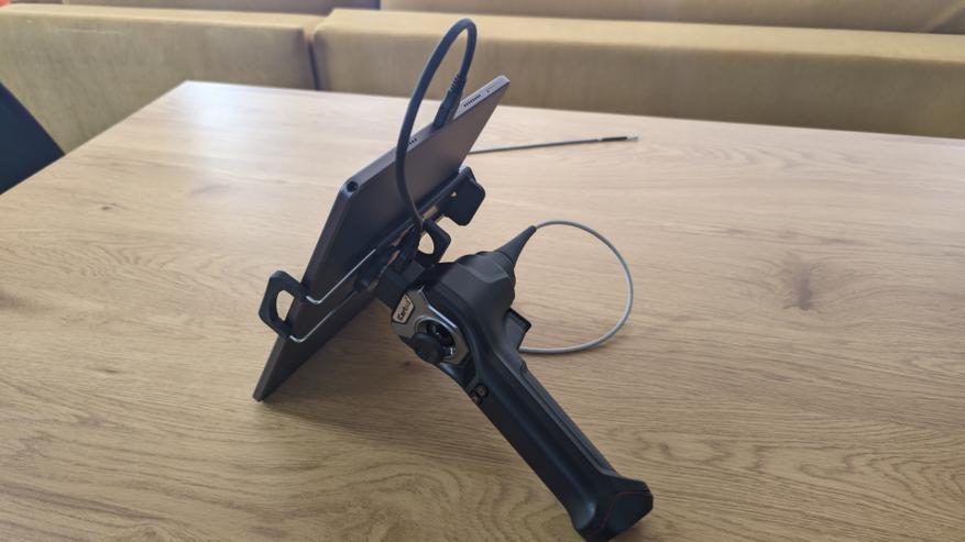 С верхней стороны рукояти установлен съемный держатель для мобильных устройств. Он фиксируется на корпусе и может устанавливаться в двух положениях. Конструкция позволяет закрепить как смартфон, так и небольшой планшет. Держатель имеет раздвижной механизм и достаточно жестко фиксирует устройство.