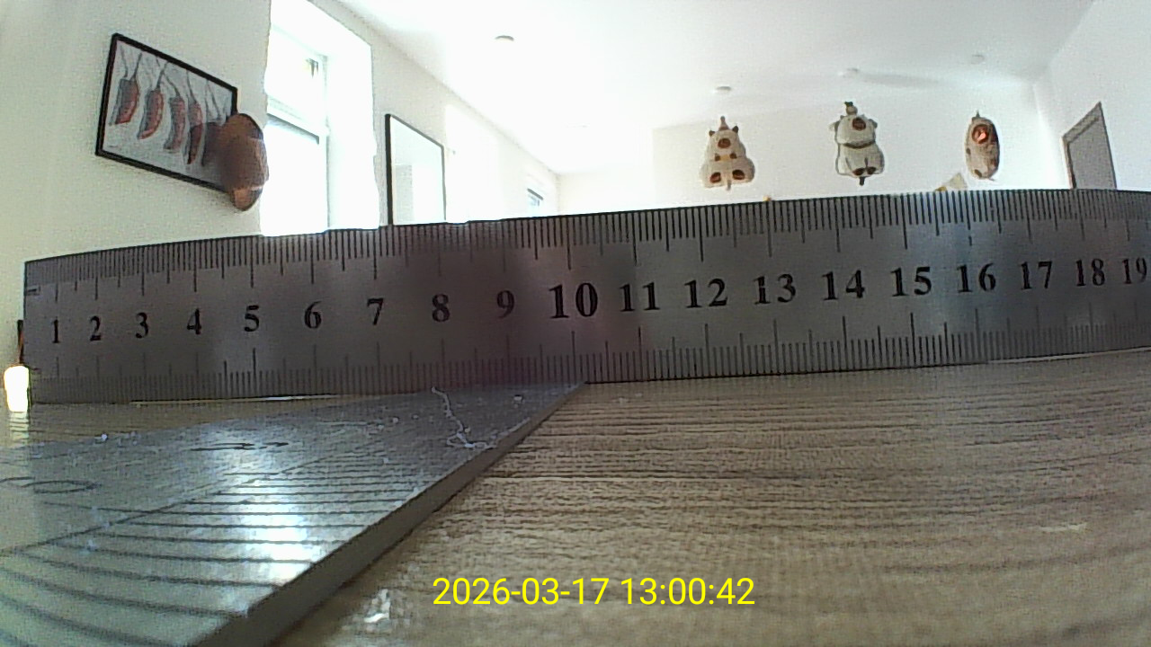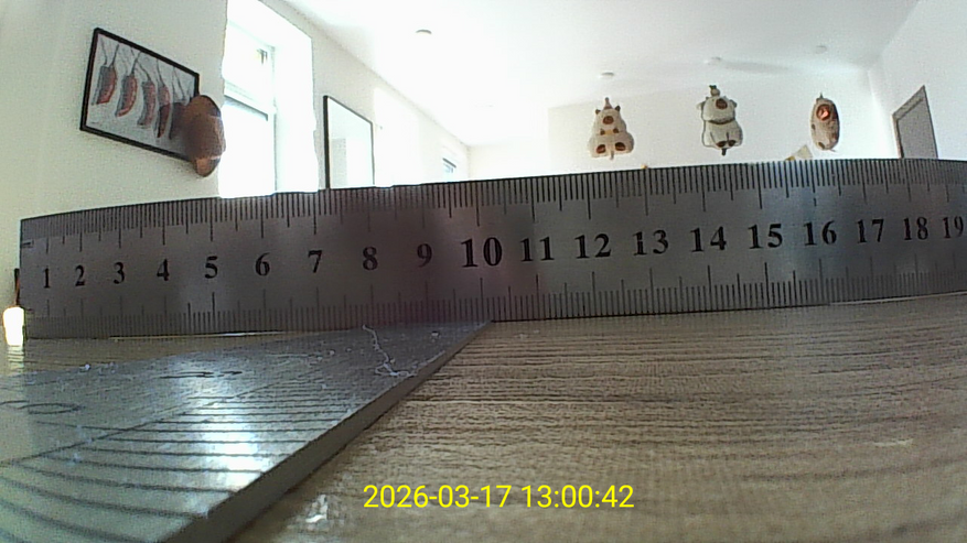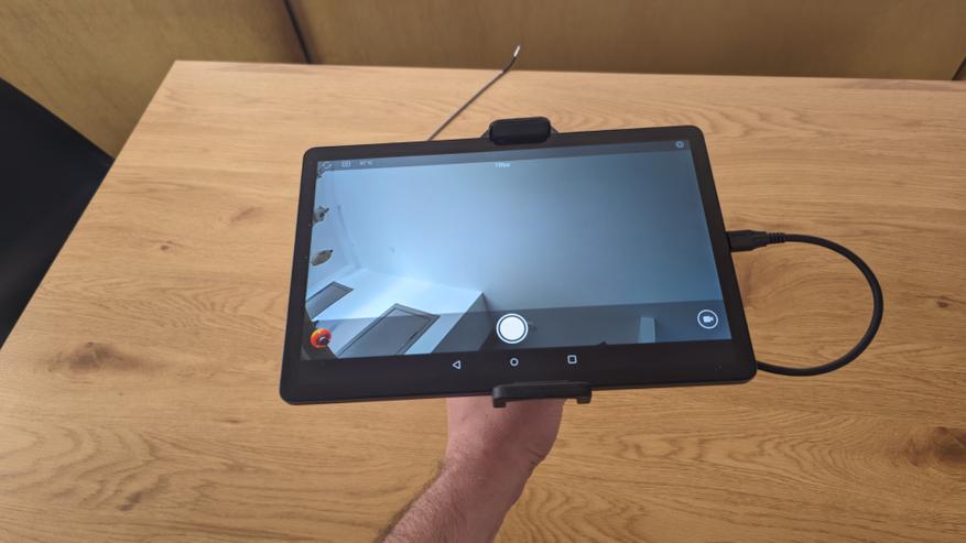 Для проверки угла обзора я провел простой замер с линейкой. Камеру зафиксировал на расстоянии 10 см, а перед ней разместил линейку в горизонтальной плоскости. В кадр попал участок примерно от 0 до 195 мм. Если перевести это значение в угол обзора, получается примерно 89 градусов. Важно учитывать, что подобный замер в домашних условиях всегда имеет небольшую погрешность: влияет точность установки камеры, положение линейки и характер искажений по краям кадра, которые типичны для широкоугольной оптики. Тем не менее полученное значение практически совпадает с заявленными 90°, и на практике это означает, что камера действительно охватывает достаточно широкую область перед собой, позволяя видеть не только центральную часть, но и участки по сторонам без необходимости постоянно менять положение зонда.