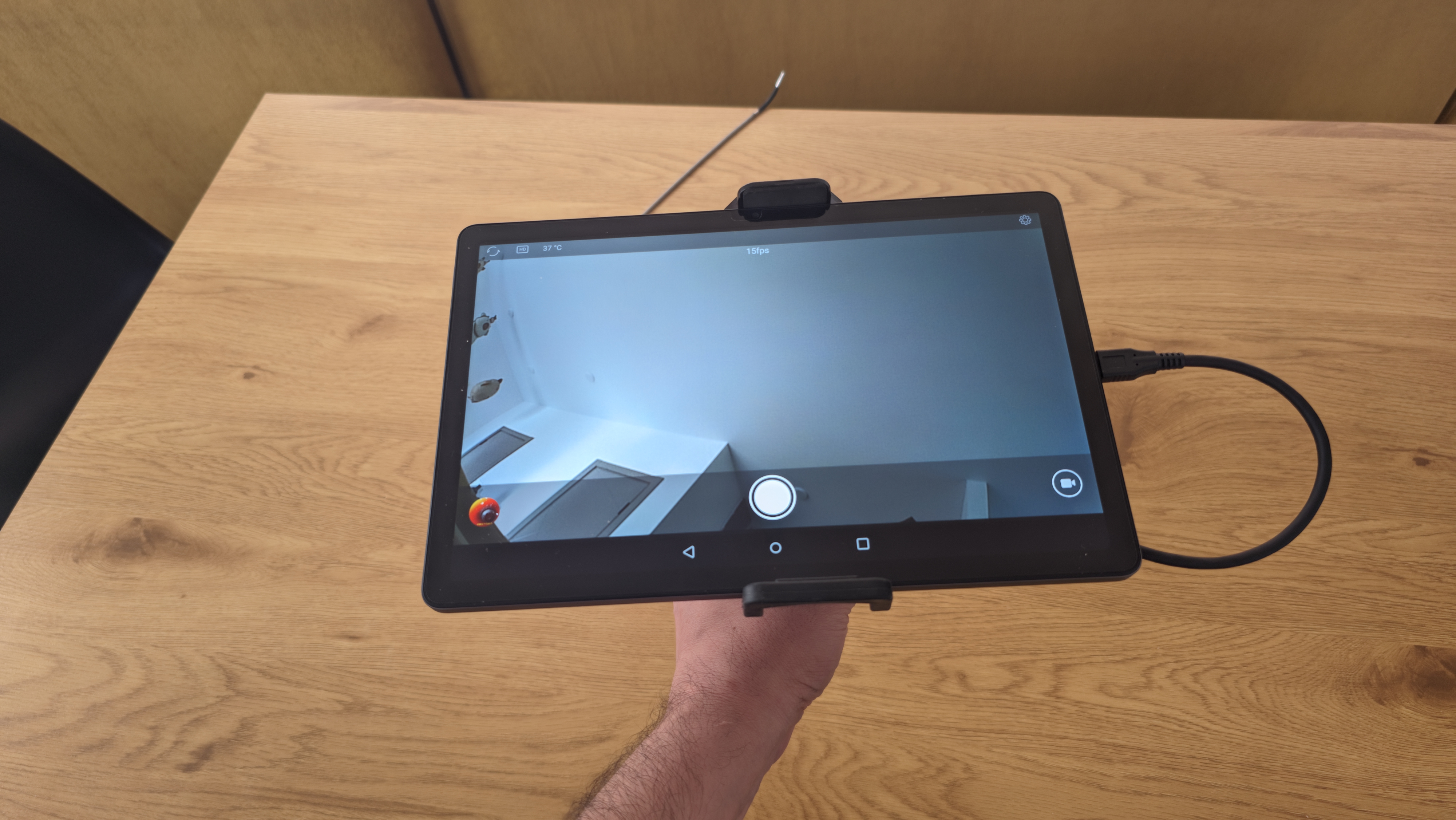 Особенность конструкции заключается в том, что у устройства нет собственного дисплея. Экраном служит подключенный смартфон или планшет. Передача изображения выполняется через USB-кабель, а видеопоток отображается на мобильном устройстве в режиме реального времени. Это позволяет использовать экран смартфона как основной монитор для наблюдения за изображением и сразу сохранять полученные фотографии или видеозаписи в память устройства. Для работы используется мобильное приложение USEE, доступное для устройств на базе iOS и Android. Через приложение можно наблюдать изображение с камеры, делать снимки и записывать видео. Файлы сохраняются непосредственно в памяти мобильного устройства. При использовании смартфонов на платформе Android необходимо, чтобы устройство поддерживало функцию OTG и возможность подключения внешней камеры.