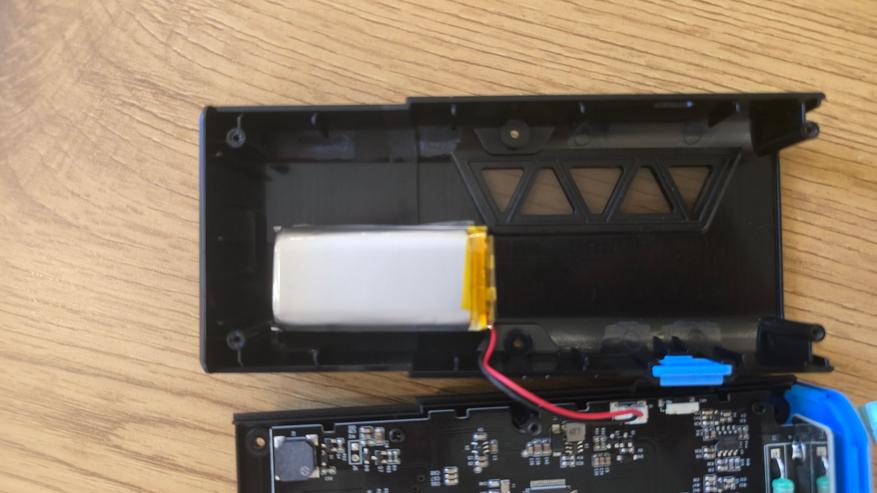 Слева в корпусе установлен литий-ионный аккумулятор типоразмера 102550 с емкостью 1500 мАч и номинальным напряжением 3.7 В. Он подключен к плате проводами через разъем, что упрощает возможную замену. Аккумулятор зафиксирован внутри пластиковой половины корпуса без дополнительных прокладок.