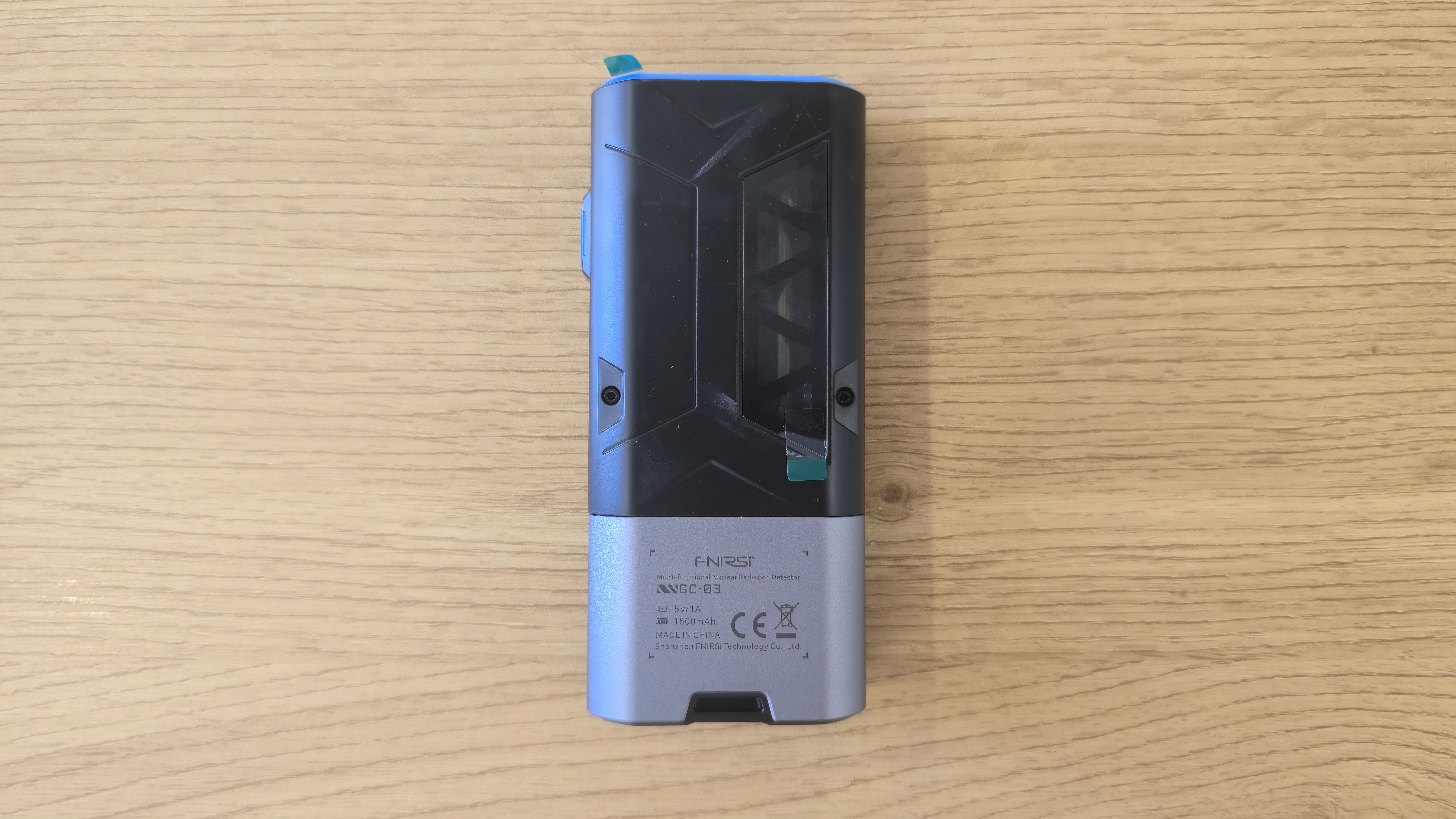 Задняя часть устройства сделана комбинированной: верхняя половина закрыта пластиком темного цвета с треугольными прозрачными вставками, через которые видна стеклянная трубка Гейгера-Мюллера. Нижняя часть корпуса окрашена в серый цвет, на ней напечатаны обозначения модели, параметры питания и емкость аккумулятора. По бокам, ближе к нижней части, имеются вентиляционные прорези.
